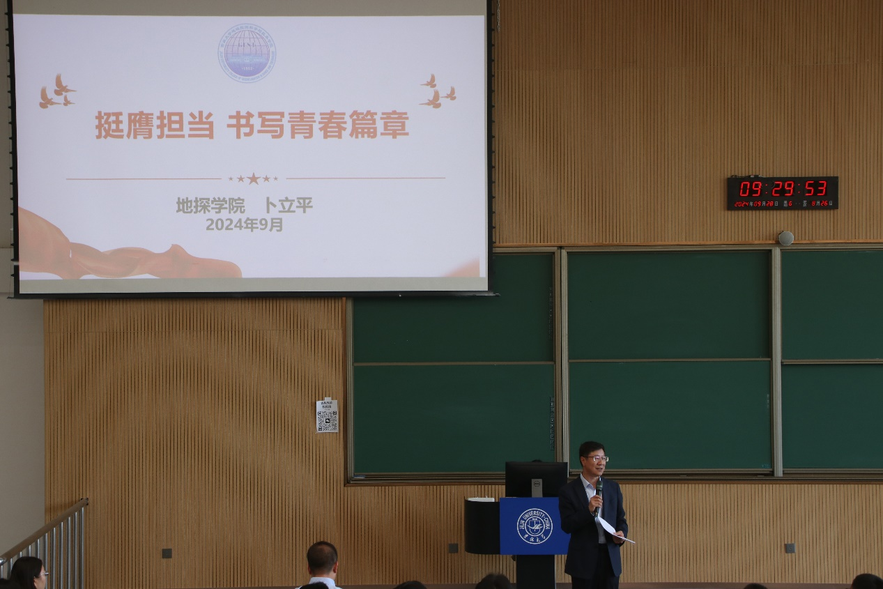 卜立平围绕爱校荣校、扎根地学、砥砺奋进三个方面,带领同学们回顾了永利yl23411和永利yl23411传承红色基因、赓续红色血脉的发展历史,讲述了以张秋生、黄大年教授等为代表的一代代地学人、地探人,踏遍青山、甘于奉献、不懈努力的精神传承,和他们坚持在星天地海、智能探测领域所做出的突出贡献。他鼓励同学们把自己的理想抱负和人生规划同祖国的建设发展、同中华民族的命运紧密联系在一起,在大学期间注重德育塑造,构建学识体系,培养各项能力、养成良好习惯,努力成为德智体美劳全面发展的社会主义建设者和接班人。