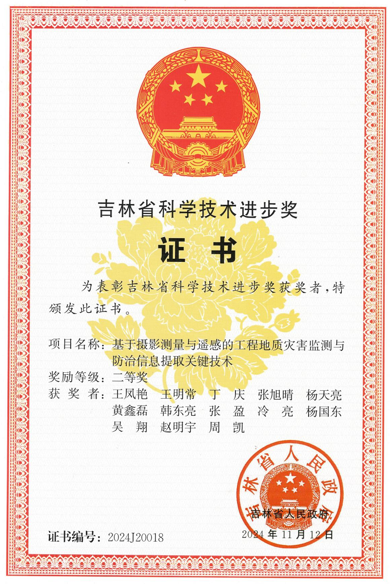 近日,吉林省科学技术厅公布了2024年吉林省科学技术奖获奖名单。公司刘财教授主持的《松辽盆地扩边探底关键探测技术创新与油气重大发现》项目荣获吉林省科学技术进步一等奖;王凤艳教授主持的《基于摄影测量与遥感的工程地质灾害监测与防治信息提取关键技术》项目荣获吉林省科学技术进步二等奖。