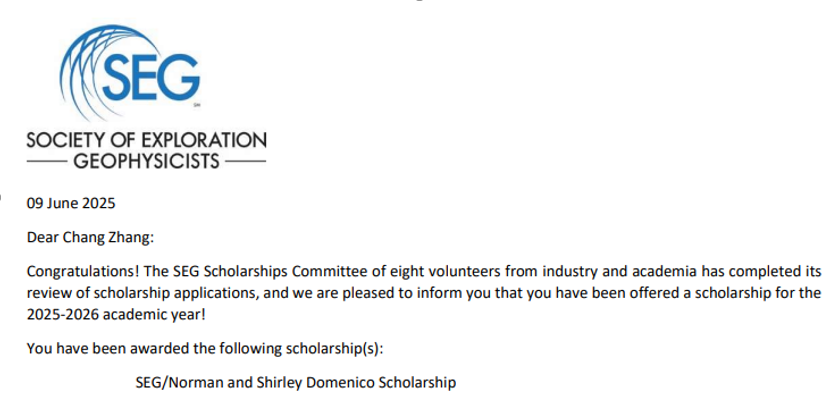 近日,国际勘探地球物理学家学会(Society of Exploration Geophysicists, SEG)来信,2023级博士研究生张敞荣获2025–2026年度SEG/Norman and Shirley Domenico奖学金。