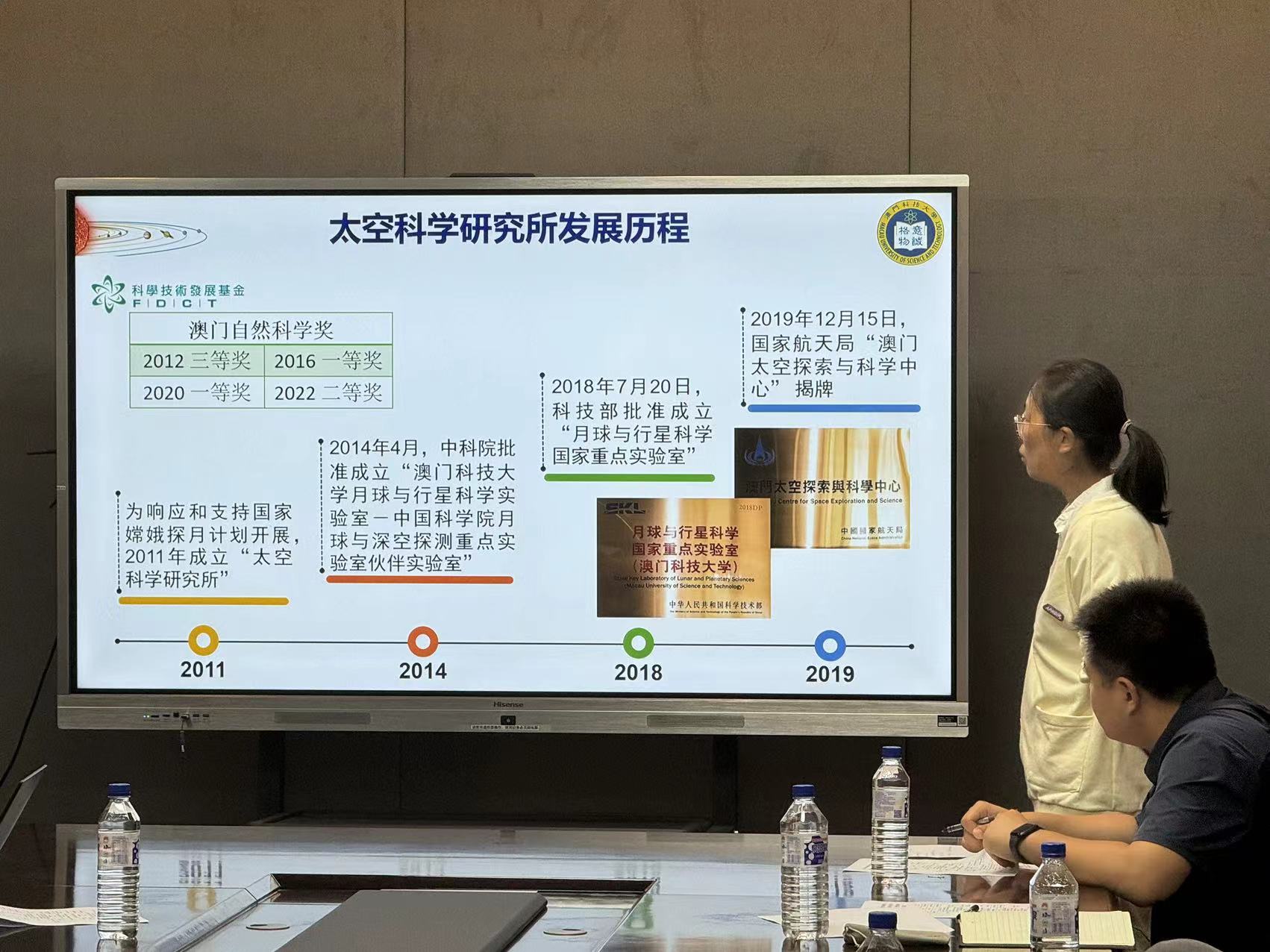 澳门科技大学徐懿教授详细介绍了澳门科技大学的发展历程、团队力量和科研实力,并以会议报告形式介绍了月球与行星科学国家重点实验室的历史沿革、学科设备、科研情况、获得到成果荣誉和优势课程情况。