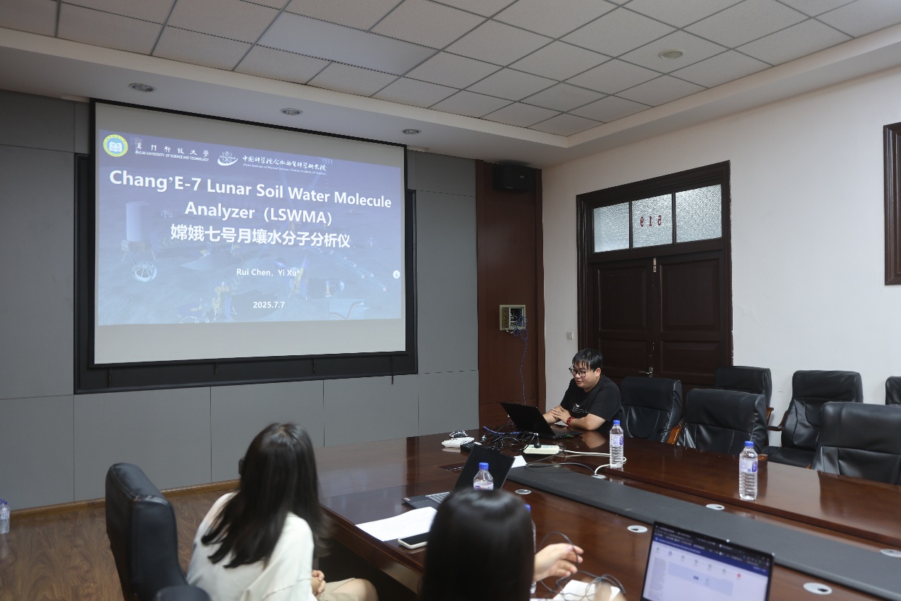 澳门科技大学陈锐博士就嫦娥七号水分子分析仪情况做了详细介绍,林艺奕博士就基于嫦娥二号卫星微波辐射计数据的月表亮温制图和热异常研究设想和发现作学术交流。