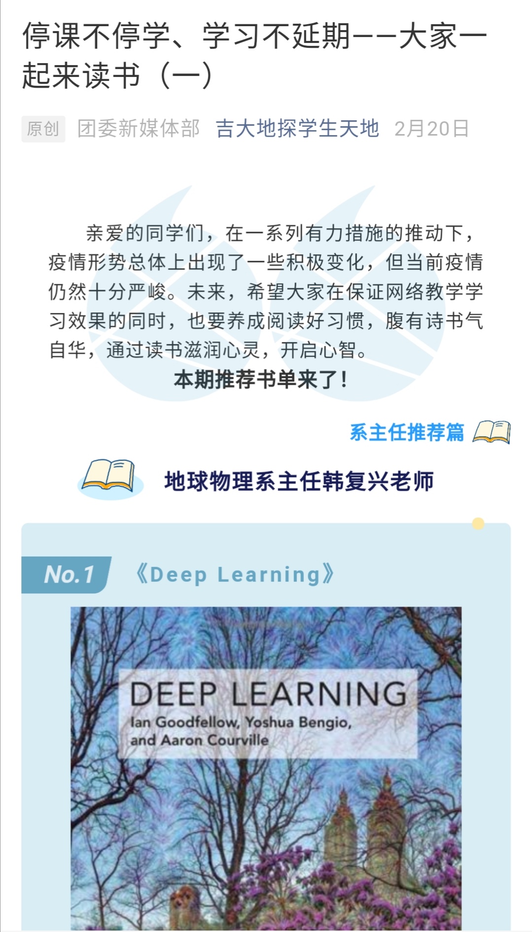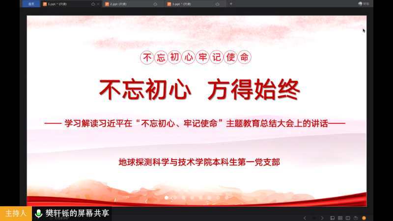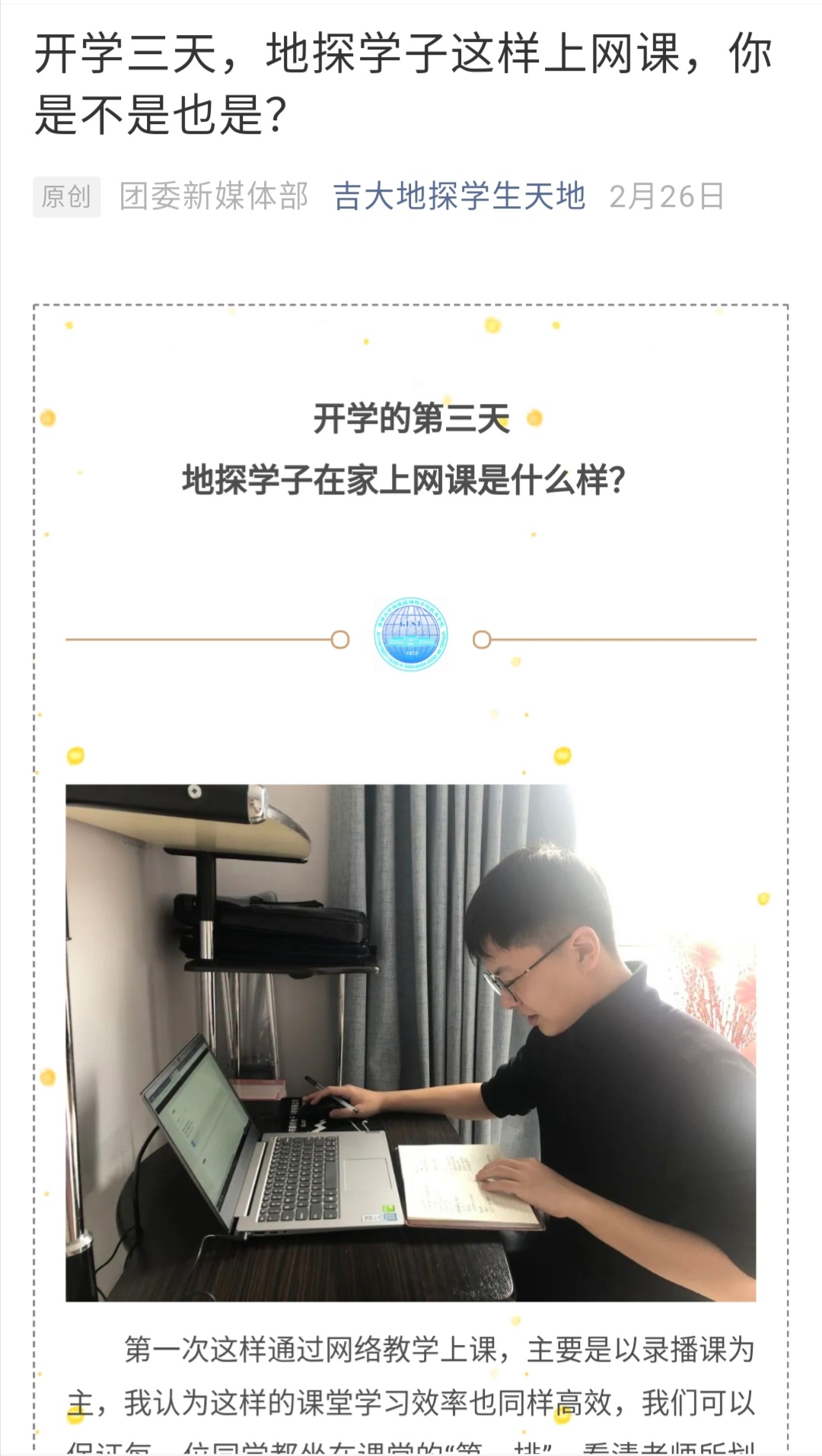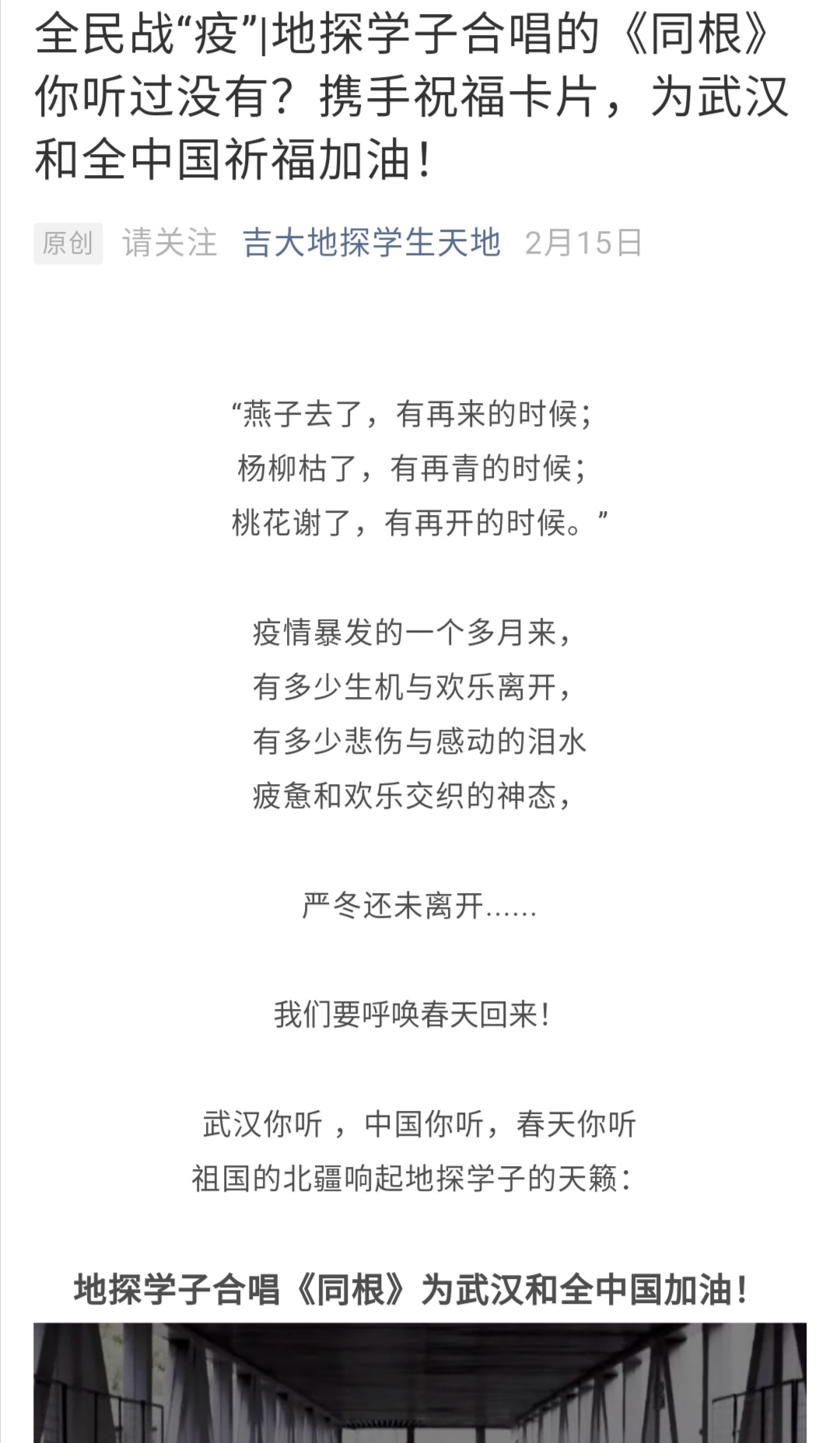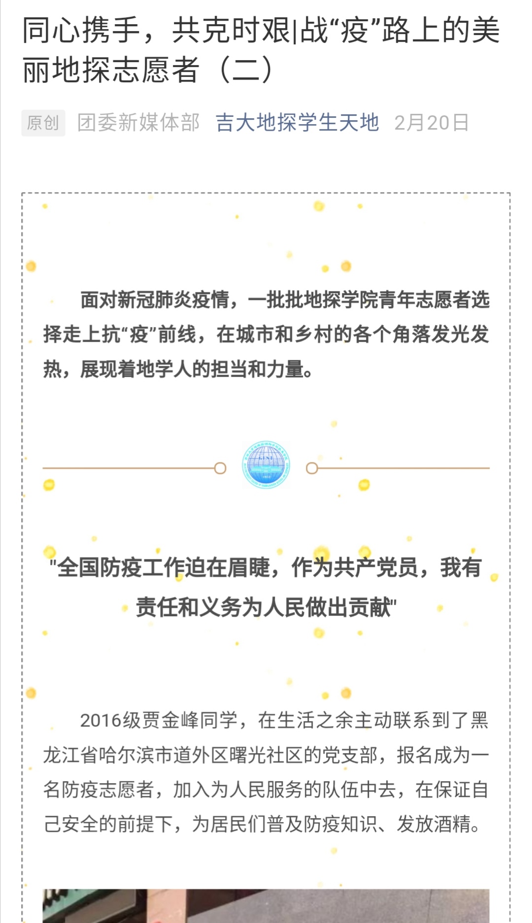 公司团委联合专业名师开展“一周读书挑战”读书分享活动、“美食大作战”等系列活动,宣扬疫情期间公司员工志愿者事迹,制作发布《同根》视频,凝聚地探力量,共克时艰。本科生第一党支部通过线上党支部会议,积极开展“学习习近平在“不忘初心、牢记使命”主题教育总结大会上的讲话”、“学习习近平总书记关于疫情防控工作重要讲话精神”等主题党日活动。本科生第二党支部发布倡议书,号召员工党员充分发挥党员先锋模范作用,并积极响应党组织号召,组织党员自愿捐款抗击疫情。2017级黄大年班团支部向全院员工发出抗击疫情期间行为倡议书,号召同学们在疫情期间配合国家和公司对防疫工作的要求,凝心聚力,以实际行动来践行“黄大年精神”,为抗击疫情做出自己的贡献。