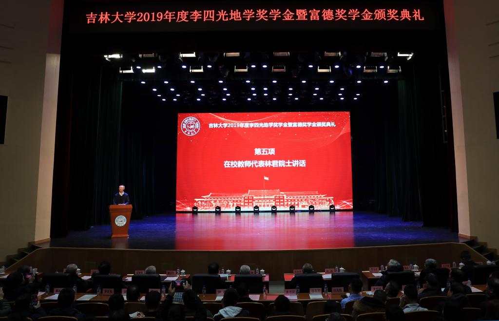 典礼第五项,李四光地学奖学金基金理事会及永利yl23411北京员工会地学分会代表董良在致辞中对获得奖励的老师和同学表示热烈的祝贺,希望全体地学学子牢记“求实创新,励志图强”的吉大校训,践行“团结创新,刻苦求实”的长院精神,弘扬“红、白、黄”三源色精神,努力,团结,奋斗,前进,谱写人生亮丽的篇章。