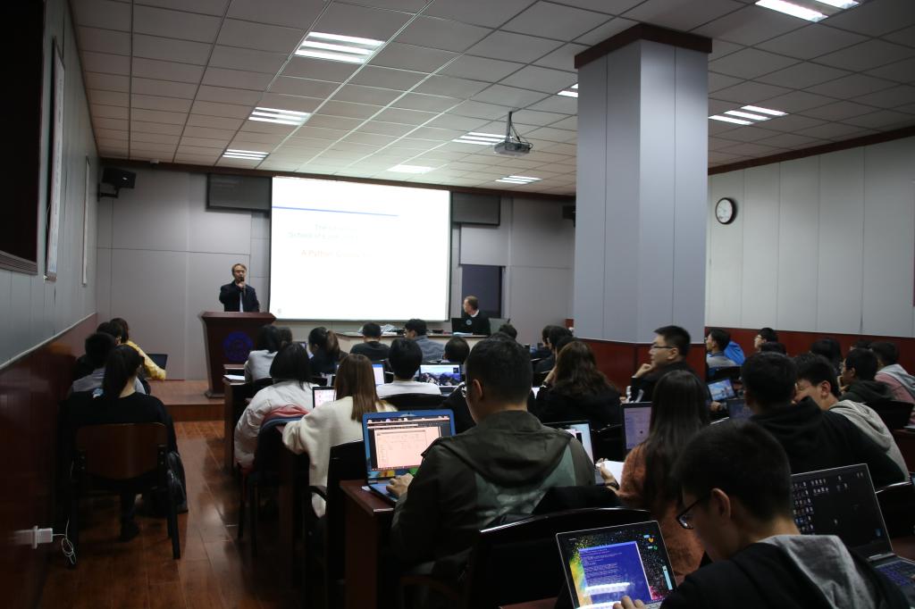 此次,公司邀请到了澳大利亚昆士兰大学的Lutz Gross博士承担讲授任务。此次课程面向本科生及研究生,讲授“Python3程序设计语言在数值模拟中的应用”,Lutz Gross博士在2019年10月28日-10月31日晚6点—8点地质宫449进行授课。课程开始前,永利yl23411副经理冯晅教授对Lutz Gross博士进行了介绍,员工对课程展现出极大的热情与积极认真的态度。大量员工参与其中,让宽敞的教室变得十分拥挤,现场氛围热烈。此课程对员工专业领域内模拟仿真,专业知识理解以及操作能力都有极大的帮助。