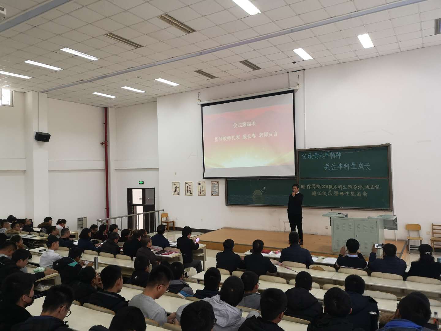 2018级本科生指导教师、兼职班主任殷长春代表全体班导师发言。殷老师在发言中为同学们简单介绍了公司雄厚的教学与科研实力,勉励全体同学珍惜时光,要在人生的转折点上把握好方向,通过自己的刻苦奋斗走向成功的彼岸。