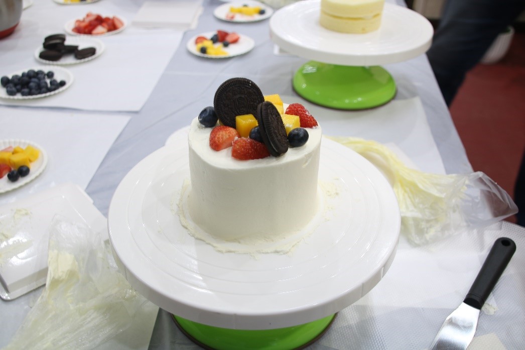 活动中,平日严谨认真的老师们化身心灵手巧的厨神,亮出了各自的绝活,涂抹奶油、水果装饰,活动现场弥漫着快乐和幸福的味道。看着自己的劳动成果,老师们都很有成就感,十分开心,大家体会着自己动手制作美食的快乐,享受着欢乐时光。