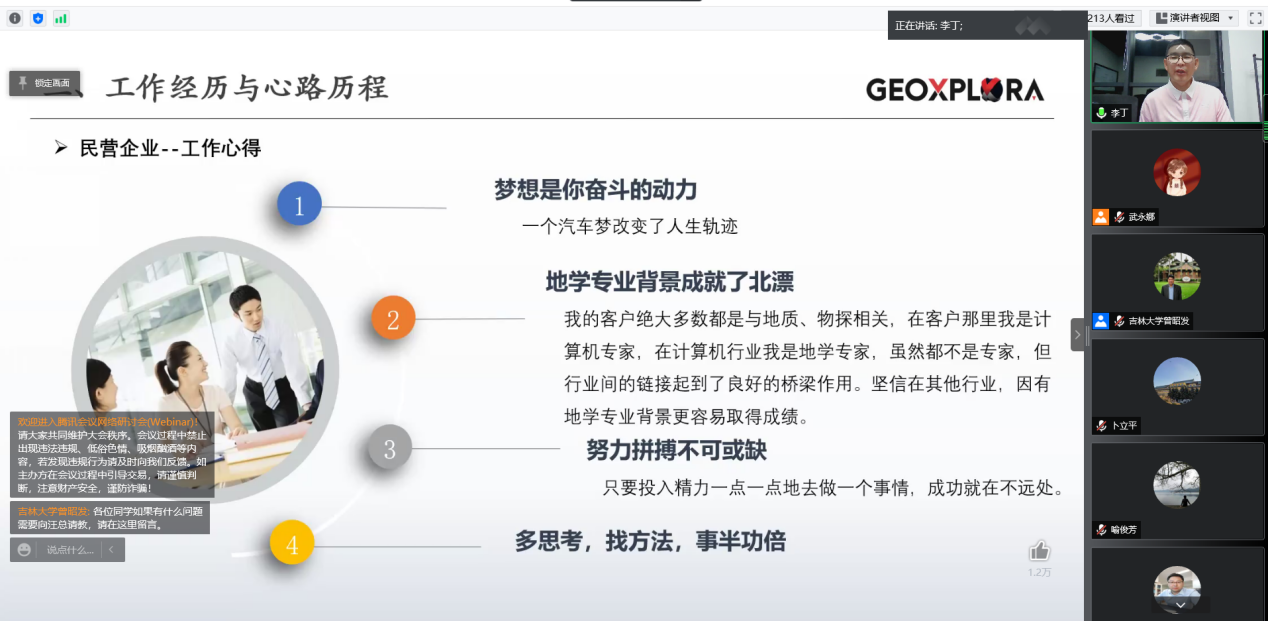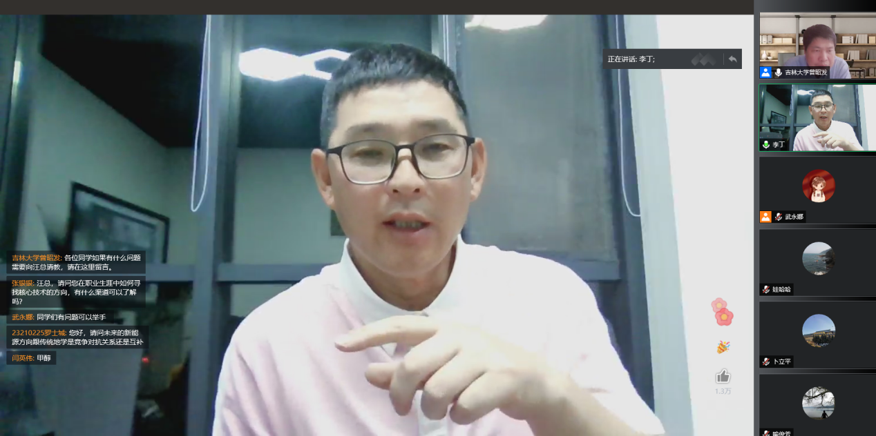 汪渝林员工以“地学专业背景与多元化职业的成长之路”为题,向同学们讲述了自己的职业发展经历,介绍了地学专业的发展优势以及吉大地学专业在行业中的重要地位,并结合个人创业工作实践分享了四点心得感悟:一是梦想是奋斗的动力;二是地学专业背景成就了北漂;三是努力拼搏不可或缺;四是多思考,找方法,事半功倍。 汪渝林谈到,同学们应对自己拥有吉大地学人的身份而自信、自豪,希望同学们在自我坚持不懈的信念与师长的引领下掌握扎实的专业知识,为未来发展奠定坚实基础。