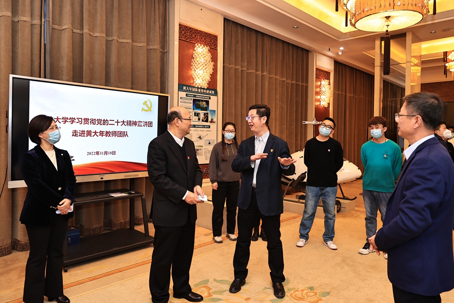 不远处一架无人机吸引了众人的目光,这架无人机机身轻盈,八角张开,可以克服山区障碍物的遮挡,实现飞行测量的需求,是黄大年团队在航空物探领域的重要科研成果之一。黄大年式教师团队成员于平教授对此深有感触,发问道:“科技的发展离不开人才培养,高校该如何实现人才的自主培养和着力造就拔尖创新人才?”段天璟指着面前的无人机说道:“要有自主的科技、自主的知识,自主的一系列的发明创造。这是培养自主人才的前提和基础。”“二十大报告多次强调立德树人,培养的形式可以是多样的,关键是有一颗中国心,有红色的基因、红色的血脉。”段天璟紧扣二十大报告中将人才作为第一资源的思想,进一步指出:“我们要培养从思想上到学术上到实践上的拔尖人才,既能顶天立地深入实际,又能胸怀天下博采众长。”这一观点的阐释让围在段天璟身侧的青年员工豁然开朗,坦言道:“这是二十大精神给予青年人最好的指引”。