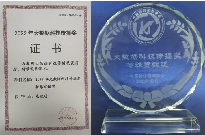 鉴于成秋明院士在我国科技领域、科技成果转换中的杰出贡献,以及在国内外大数据与科技传播领域中的重要影响和作用,受本届评委会审慎推荐和严格评审审定,其获得“2022年大数据科技传播奖特殊贡献奖”。据悉,本次还评审出作品奖9项、团体奖13项、个人奖28名。