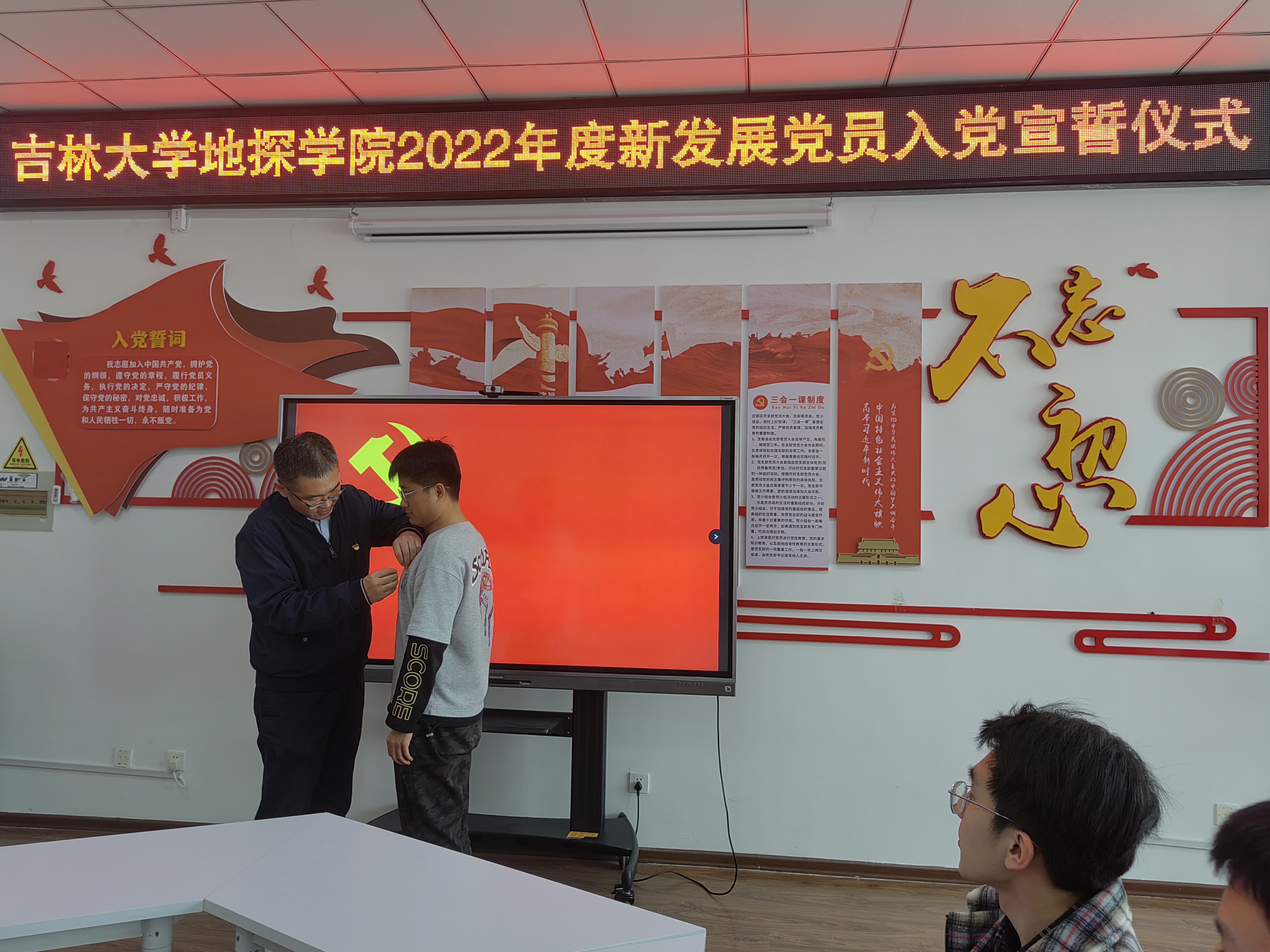 仪式上,全体师生党员共唱《国际歌》。李洋同志为新发展党员代表佩戴党徽。2022年度新发展党员面向党旗进行了庄严宣誓。刘子维同学代表全体新发展党员进行了发言,他表示作为一名新党员,将持续深入学习领会习近平新时代中国特色社会主义思想和党的二十大精神,不断提升思想政治修养,努力学习,勇于创新,拼搏奋斗,以实际行动践行入党誓言。