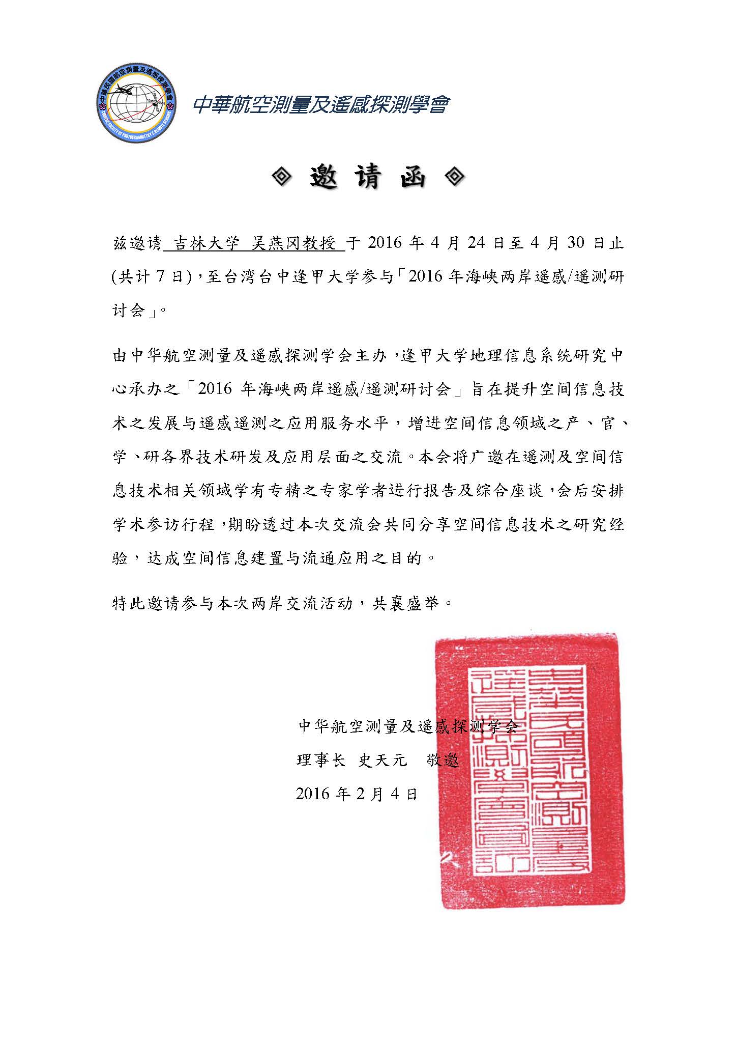 出访任务:参加2016海峡两岸遥感/遥测研讨会
