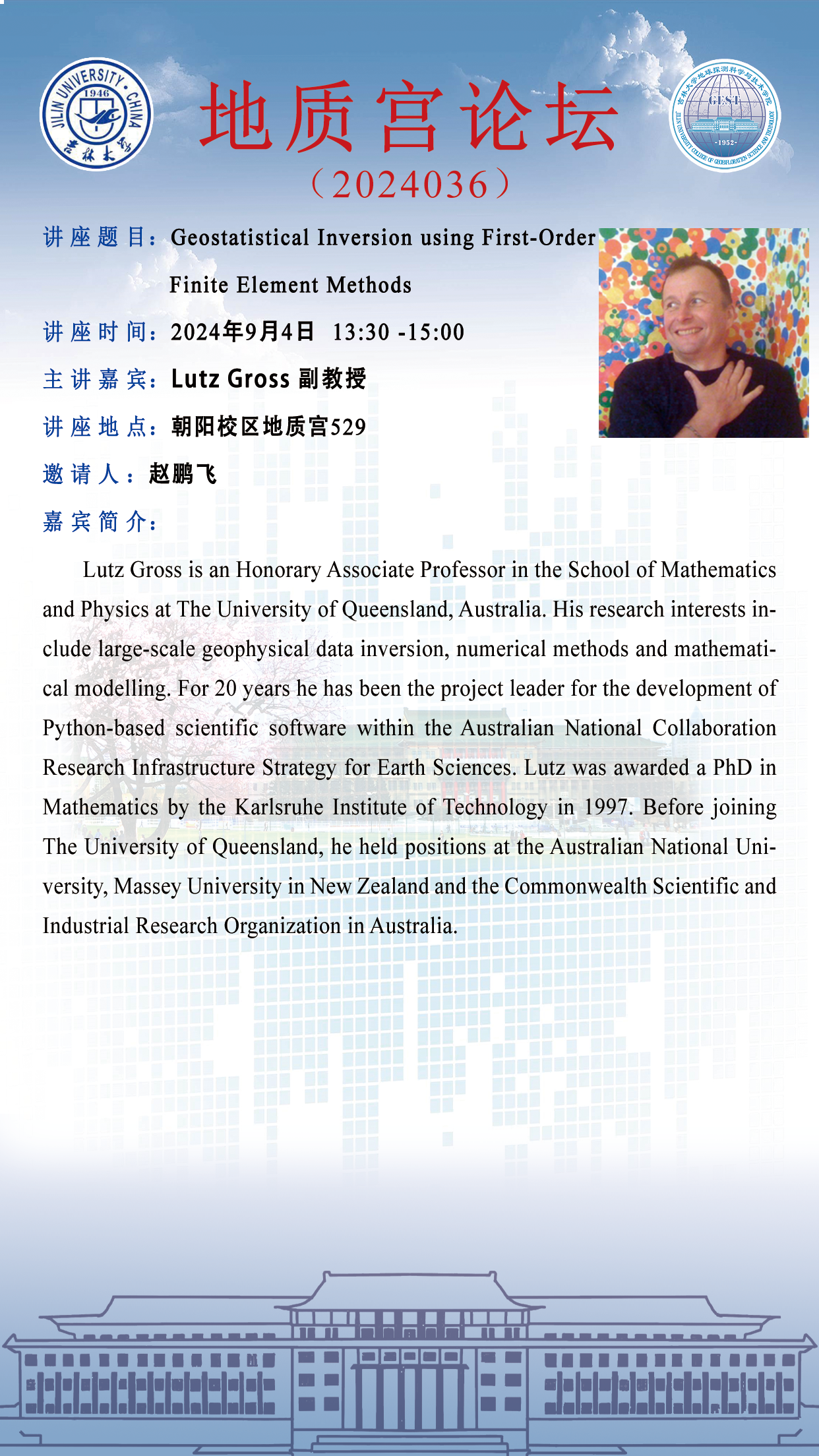 永利yl23411·地质宫论坛(2024036)—澳大利亚昆士兰大学Lutz Gross荣誉副教授学术报告