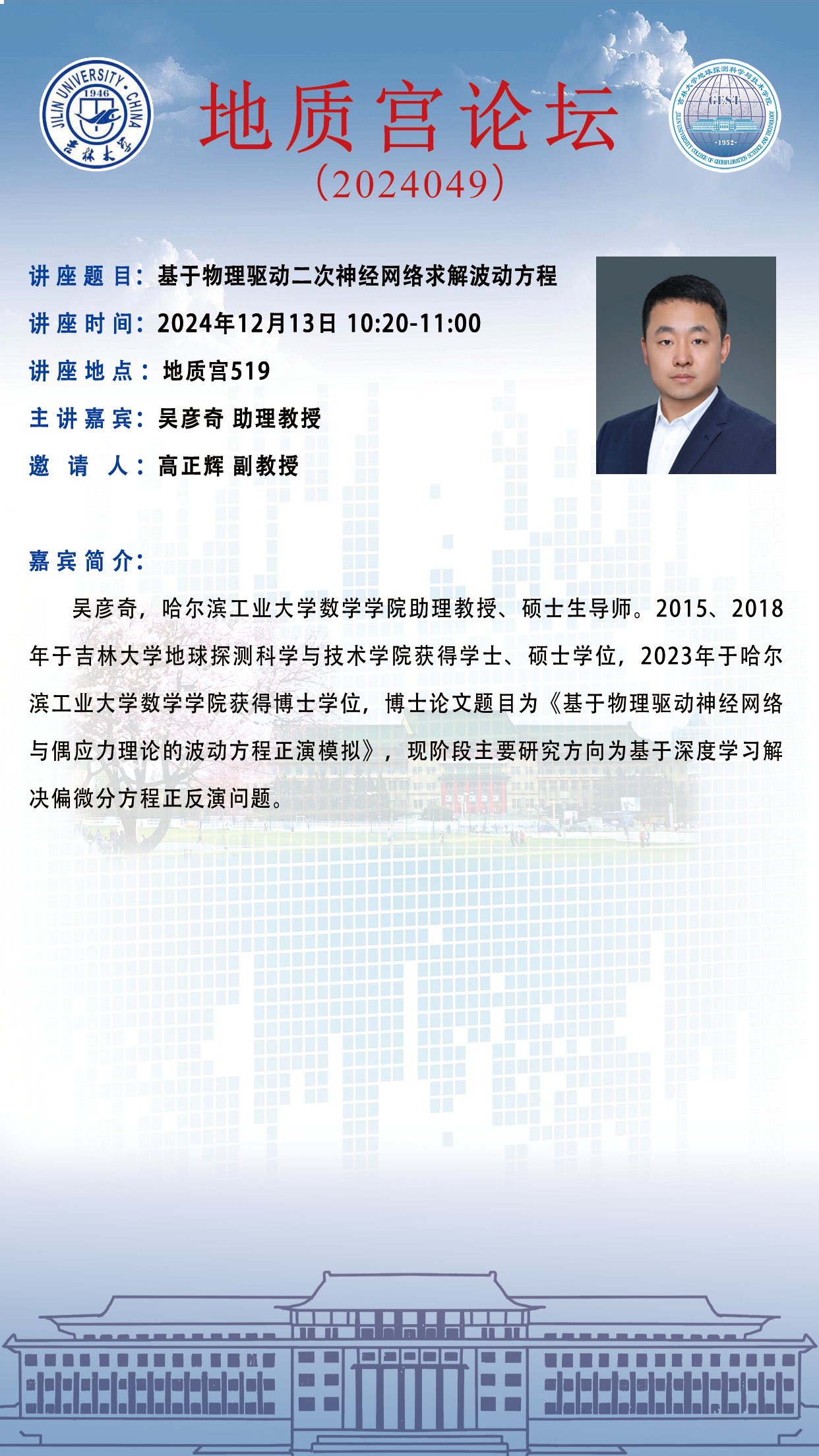 永利yl23411·地质宫论坛(2024049)—哈尔滨工业大学吴彦奇助理教授学术报告