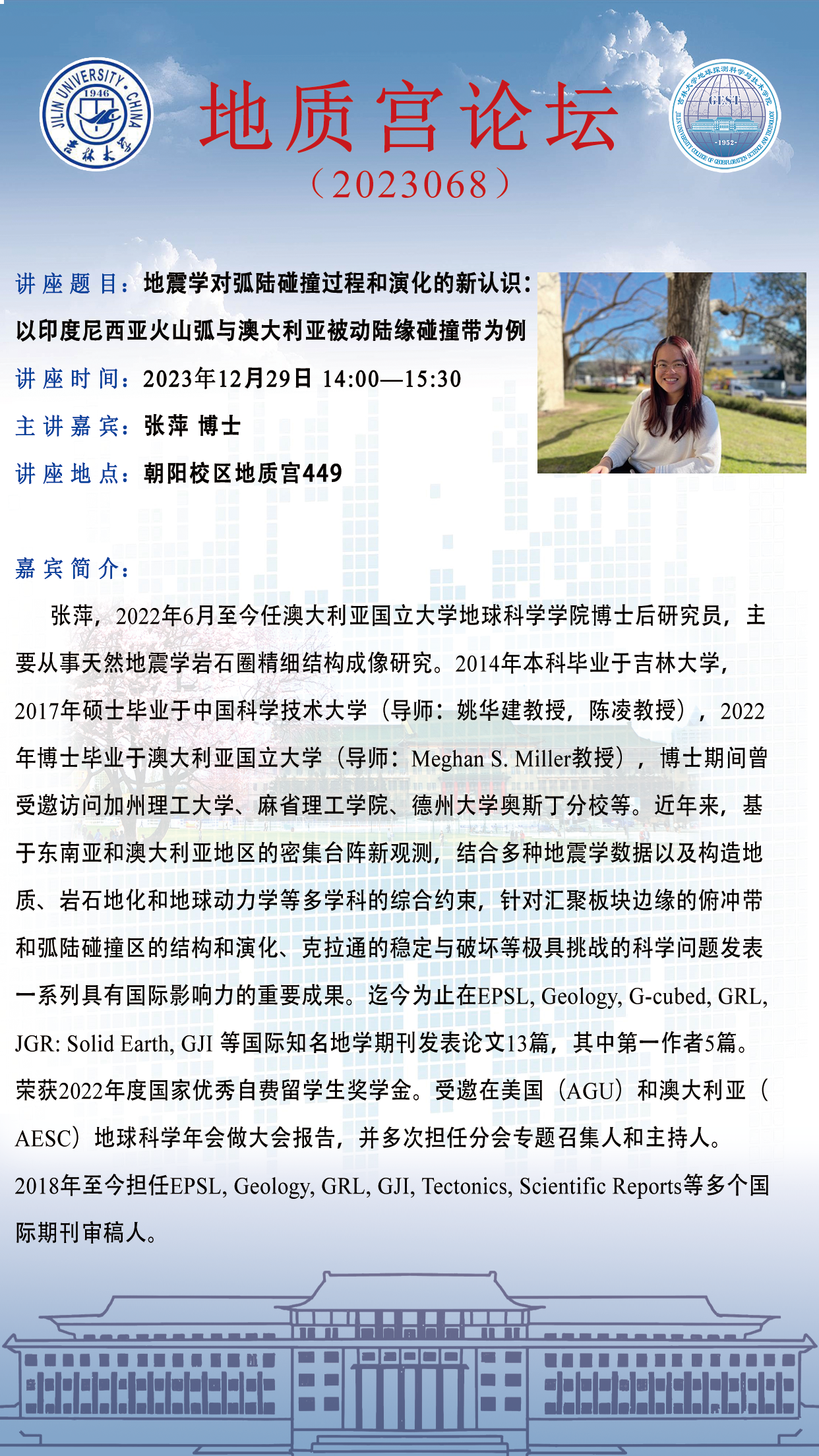 永利yl23411·地质宫论坛(2023068)—澳大利亚国立大学地球科学公司博士后研究员张萍博士学术报告
