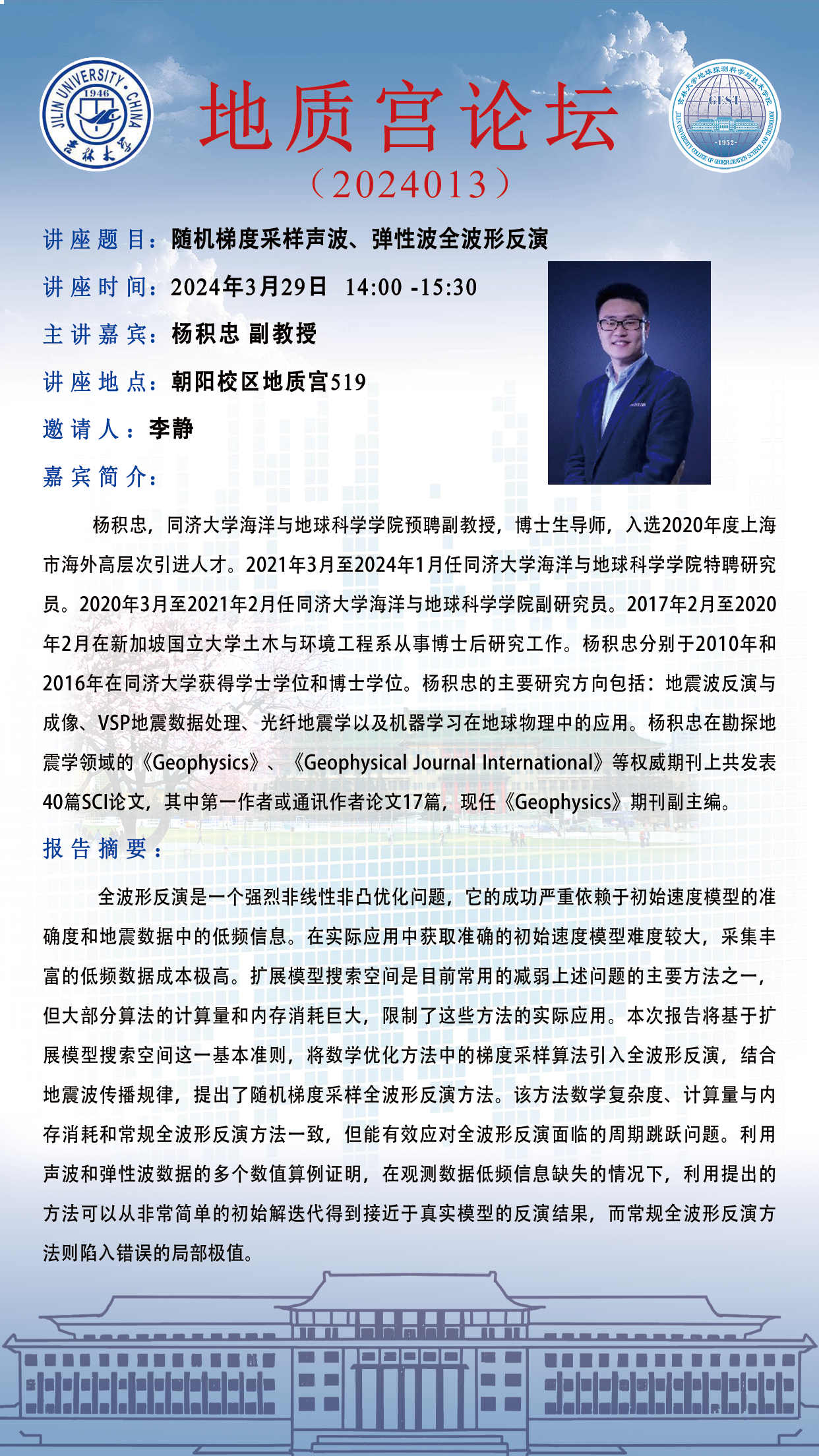 永利yl23411·地质宫论坛(2024013)—同济大学海洋与地球科学公司杨积忠预聘副教授学术报告