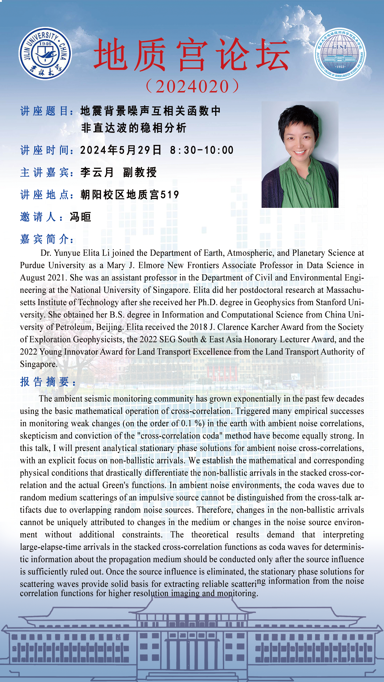 永利yl23411·地质宫论坛(2024020)—美国普渡大学李云月副教授学术报告