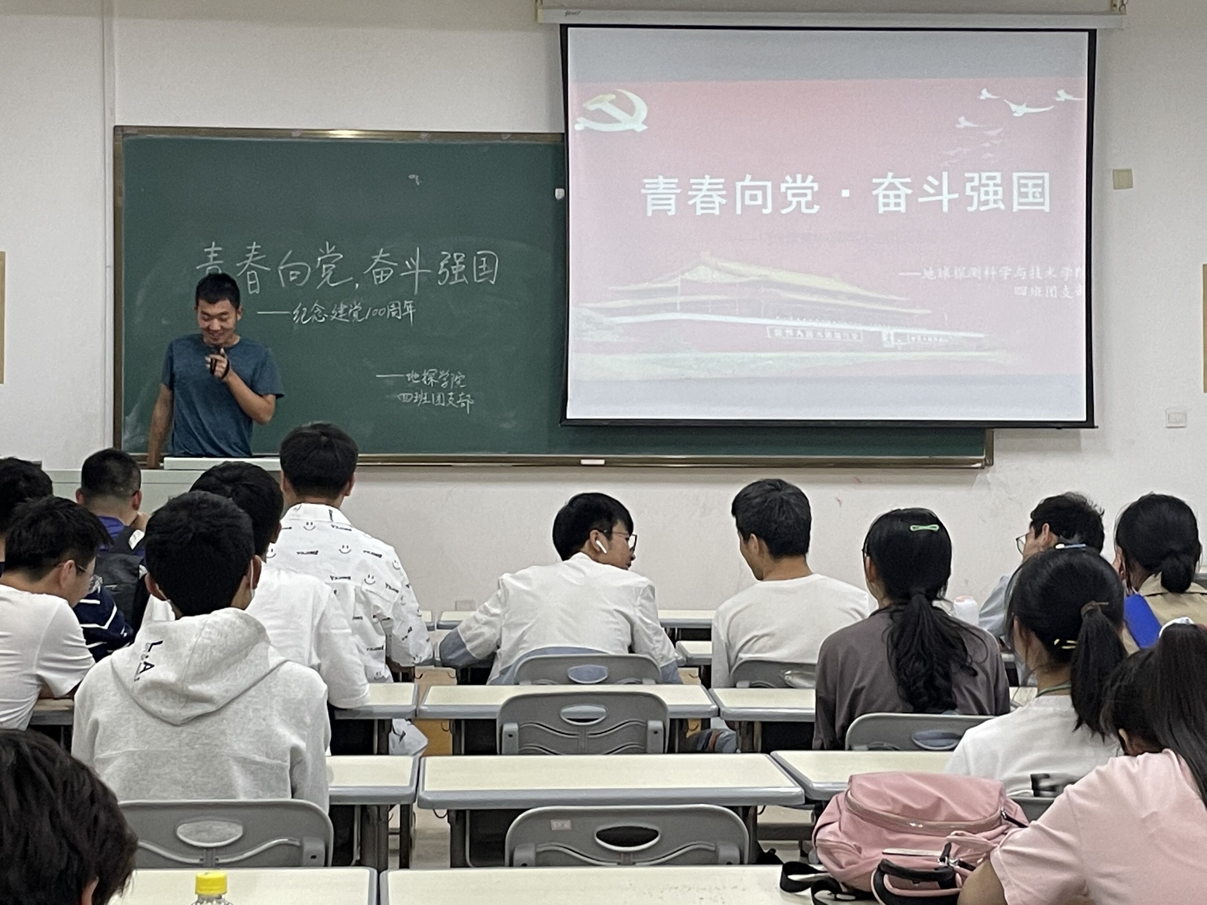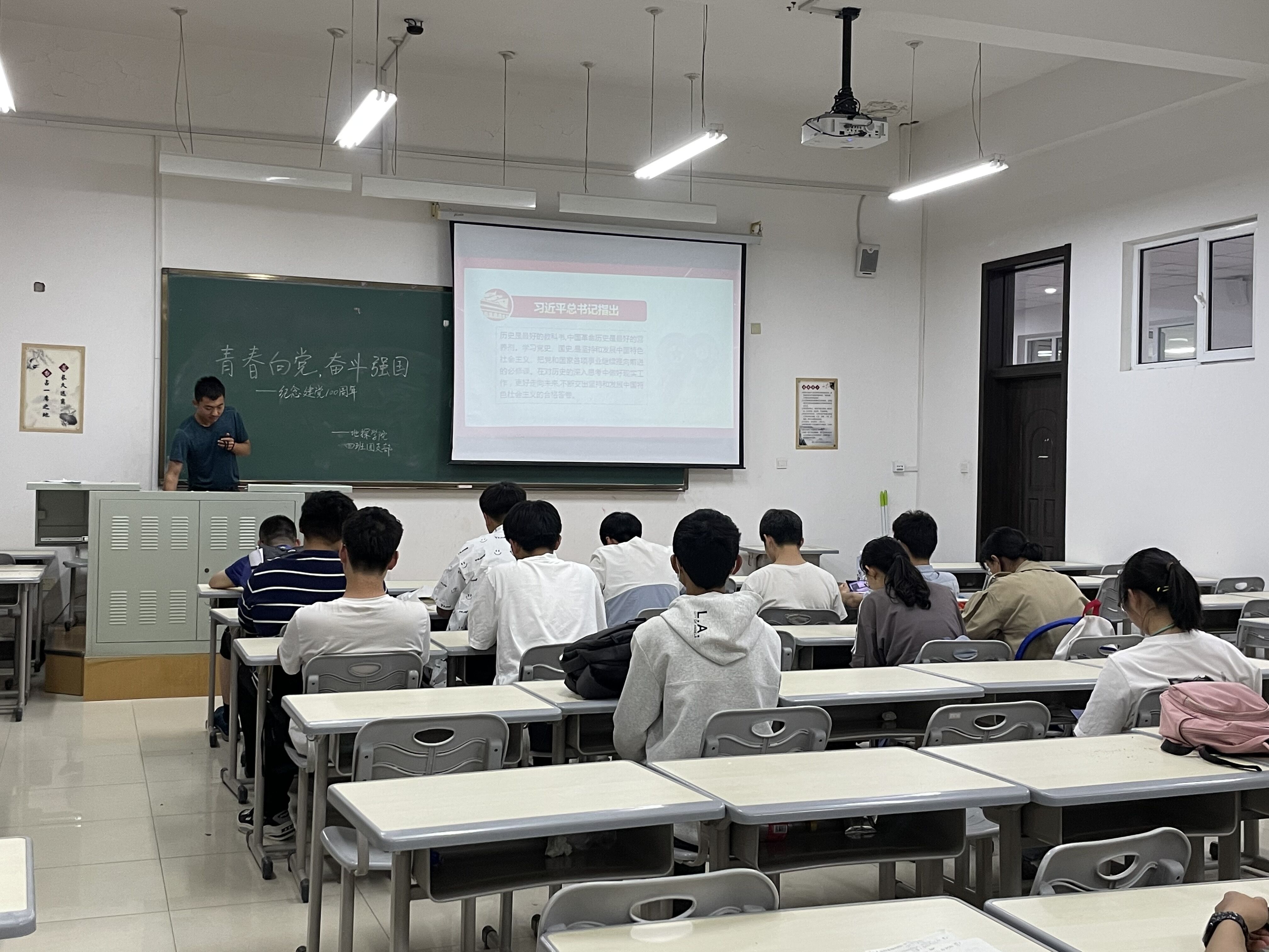 “七一”将至,为庆祝中国共产党建党100周年,2020级4班团支部于2021年5月21日晚上8点,在李四光教学楼207教室,由团支书杨丽芝主持开展了“青春向党·奋斗强国——学党史知识、诵红色经典、不忘初心、牢记使命”党史学习教育主题活动,本次活动以党的十九大精神为指导,以此引导支部全体团员加强对党的认识,进一步增强爱党、信党、听党话、跟党走的信念。