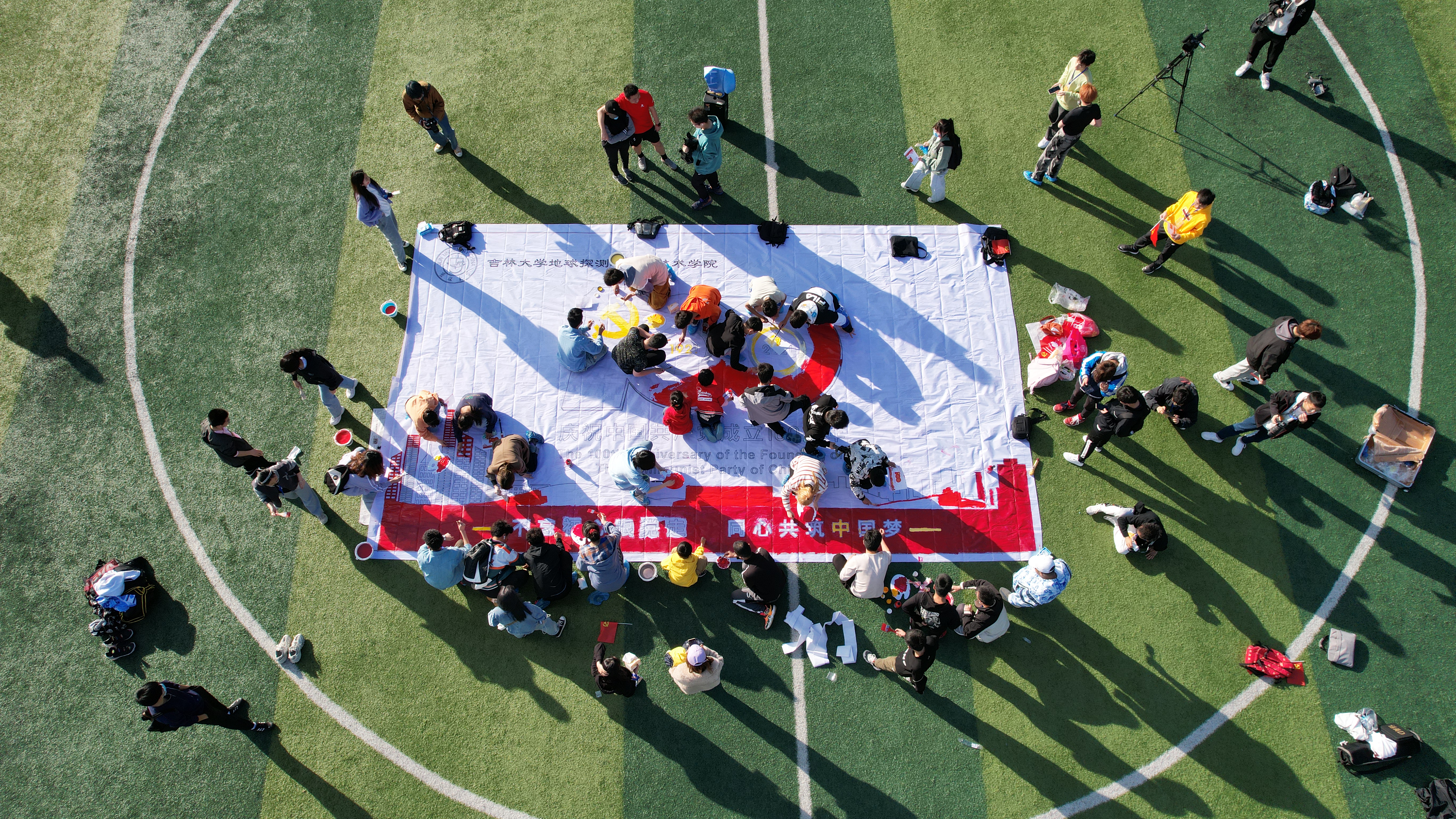 5月9日下午风和日丽,伴随着工作人员将巨幅海报在绿茵场中心徐徐展开,“无声诗里颂千秋”手绘活动正式开始。参与人员拿着大大小小的画笔,根据样图自由选取区域为这幅巨型海报上色。海报长达8米,宽4.5米,左上角为永利yl23411校徽与永利yl23411院名;中心是巨大显眼的 “100”字样,数字“1”内绘有党徽,两个“0”字中心分别绘有“1921”、“2021”字样,象征建党百年;数字下方绘有“庆祝中国共产党成立100周年”和“不忘初心跟党走 同心共筑中国梦”字样,表明本次活动的初衷,海报整体以红色为基调。在晚春温暖的阳光照耀下,三十余人在足球场中心围绕着海报齐心绘制,伴着红歌一刻不停地忙碌着,空气中洋溢着青春的气息。经过两个多小时的绘制,上色工作顺利完成,整张海报呈现出耀眼的中国红,参与活动的人员站在海报一侧通过航拍合影留念,手绘涂鸦活动圆满完成。