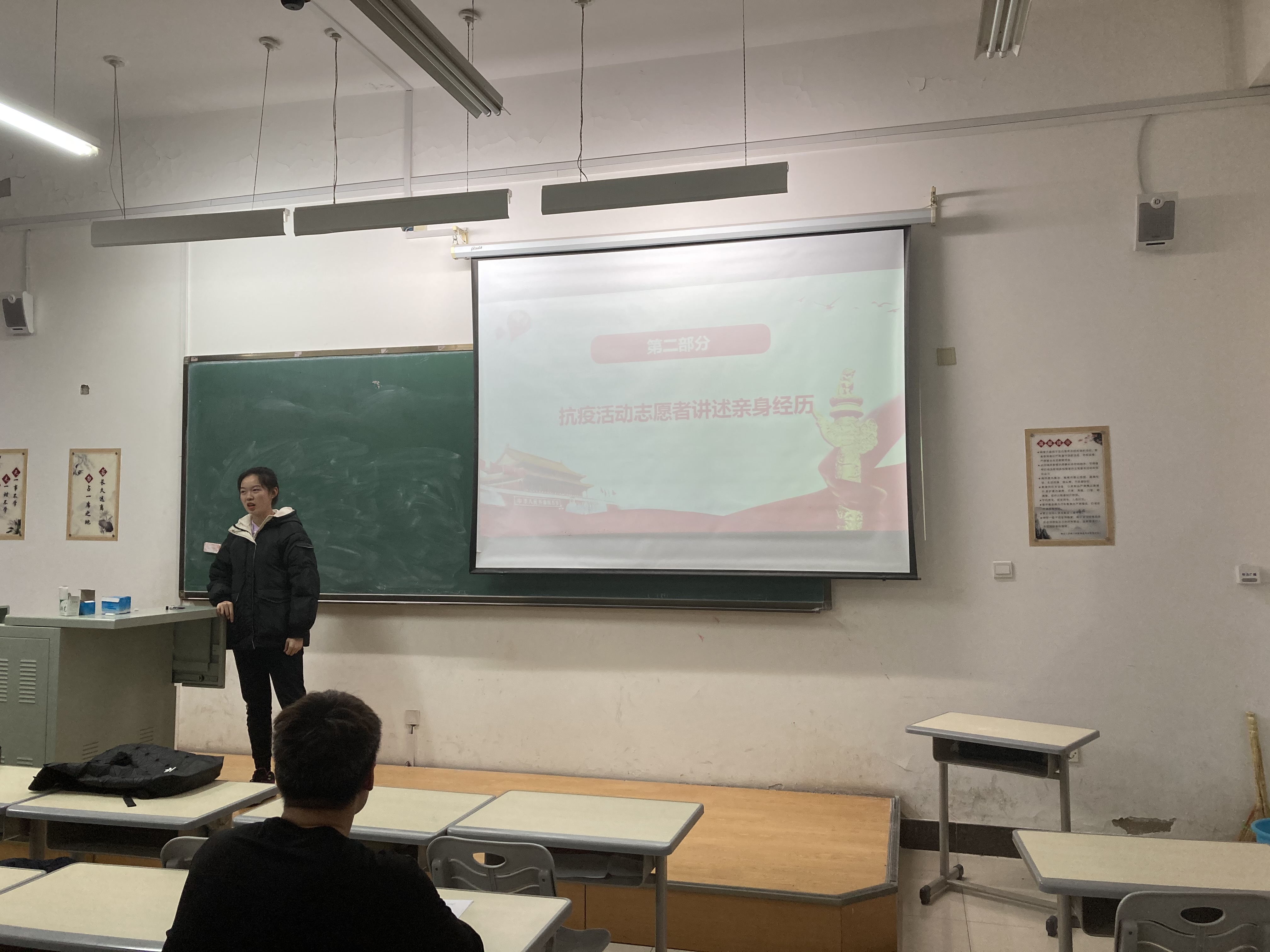 活动开始,由团支书金健豪为同学们介绍了9位抗疫英雄,有无私奉献的志愿者,有不求回报的医护人员,还有严控病毒传播的社区工作者......这些英雄在疫情中工作时的精神激励着我们,取得的抗疫成果保护着我们。每位抗疫英雄的事迹都令同学们敬佩和感动。所谓“为天地立心,为生民立命,为往圣继绝学,为万世开太平”的广阔胸襟在这些抗疫英雄的身上展现的淋漓尽致!接下来是活动的第二项,由武永娜同学和姜涵哲同学讲述她们在抗疫阶段作为志愿者的亲身经历。他们的讲述让同学们明白了,原来抗疫英雄也可以是平凡的普通人,原来抗疫这件事离大家并不远,我们每个人都可以成为保护大家的英雄。活动的最后,团支书号召大家向两位志愿者学习,在国家危难之时将个人力量全部献出,保护需要保护的中华同胞。