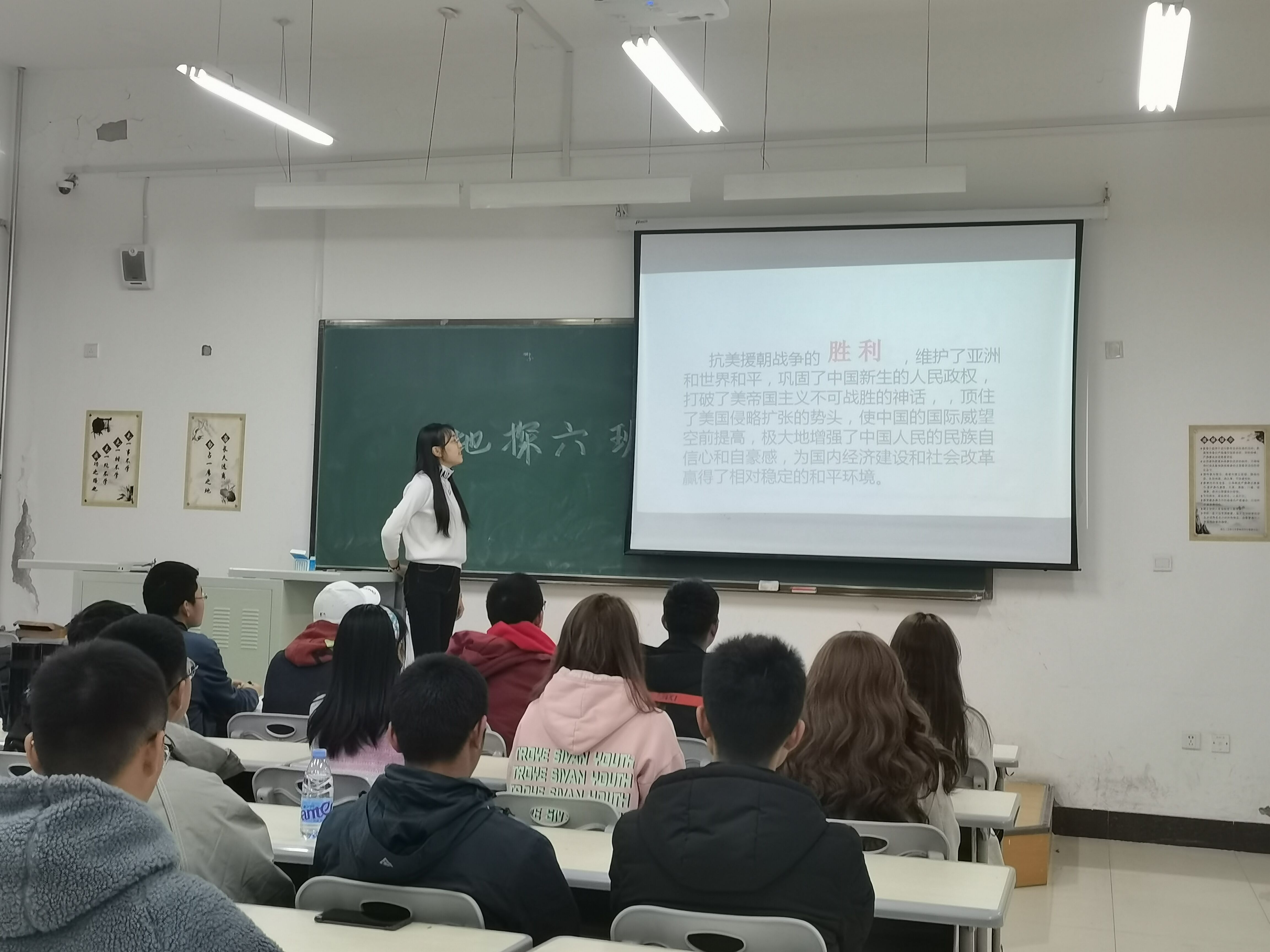 活动开始,六班团支书常佳音向同学们介绍在这个特殊的日子召开红色主题班会的目的与意义。在主讲人的带领下,同学们面对着众多历史资料与纪录片,切身感受到老一辈革命英雄身上所展现的敢打必胜的铁骨血性,以及现在所处的和平时代的弥足珍贵。在之后的小组讨论中大家一起回顾历史,讨论在现今社会我们能从抗美援朝战争中所能汲取的精神宝藏。同学们热切而又感性的发言,饱含着对历史的深思与感悟,和对那个战火纷飞年代涌现出的人民英雄的敬意。最后,班会在庄重而富有哲思的氛围里圆满结束。