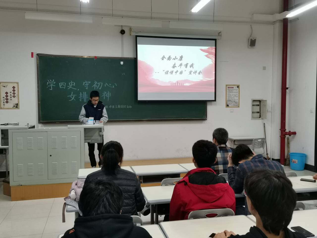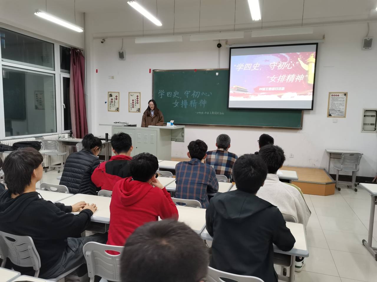 首先,团支书侯佳鑫介绍了什么是“四史”并进行解读,讲解了为什么要学习“四史”。她指出,“四史”内容各有侧重,但整体讲的是中国共产党为人民谋幸福、为民族谋复兴、为世界谋大同的实践史,中国共产党的领导是“四史”的主线。接着她讲解了女排的成功史,解读了女排精神的内涵。同时带领大家观看相关视频。同学们也进行了讨论:如何才能弘扬女排精神,并把它运用到学习生活中。最后,由18级魏越学长对本次班会进行总结,同时跟同学们分享了经验:在学习方面分享了如何自律、如何提高学习效率;在生活方面分享要学会独立面对困难。同学们认真聆听,收益颇多。