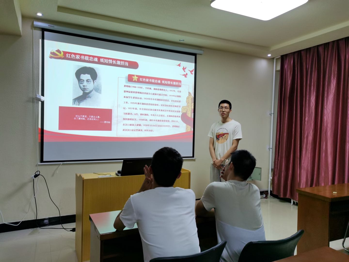 首先,3位党员刘冉明、陈向洋、高若云分别诵读了无产阶级革命家夏明翰写给妻子郑家钧的信、英雄模范赵一曼写给儿子宁儿的信、革命烈士贺锦斋写给弟弟的遗书。诵读后,与会党员就红色家书内容进行了交流和讨论,并结合自身感受,聆听体会和新时期共产党员的使命等方面谈了自己的感悟和想法。纷纷表示要在品读中深刻体会革命先烈崇高的革命情怀,永远怀念、牢记他们的遗愿与嘱托,传承革命先烈的红色基因,在传承中不断汲取力量。