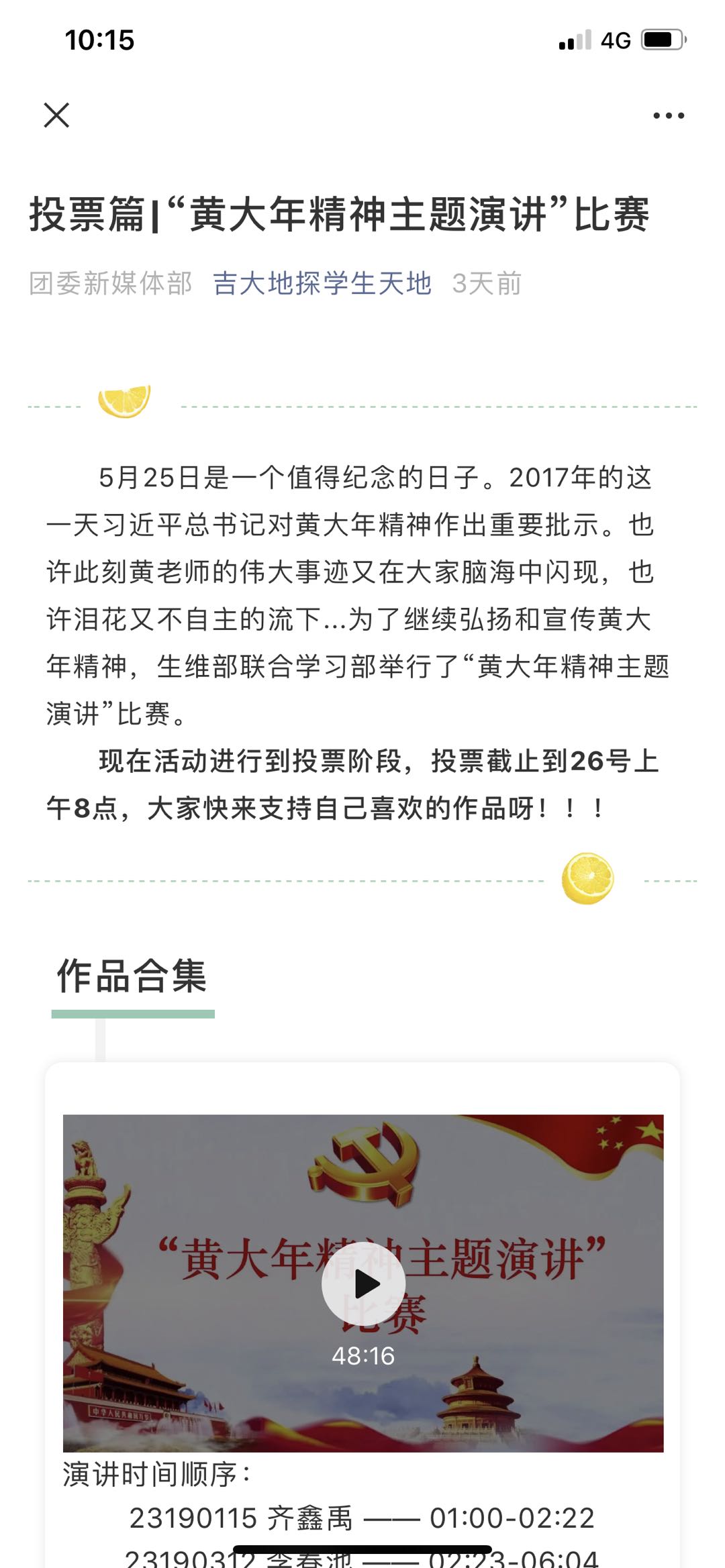 首先,齐鑫禹,李春池,黄佳慧,尚辰旭,张开宇,武永娜,董浩然,孙鹏,陈康贤8位同学依次进行了精彩的演讲录制,他们分别从黄大年老师的事迹,对其精神的认识和赞颂以及黄大年老师对自己的影响等方面展开演讲。随后,8份视频经过剪辑在微信平台展播,由大众评审进行投票。最后齐鑫禹获得一等奖,尚辰旭、张开宇获得二等奖,黄佳慧,武永娜,董浩然获得三等奖。