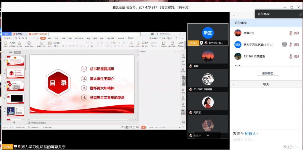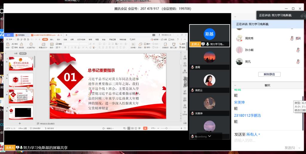 班会由青马班班长陈彦羲主持,共分为“总书记重要指示”、“黄大年生平简介”、“缅怀黄大年精神”、“马克思主义青年的使命”四大部分,带着同学们回顾了黄大年老师生前的感人事迹,重温了习近平总书记对黄大年老师先进事迹做出的重要指示,并让每位同学轮流发表了自己对黄大年精神的认识及黄大年精神对自己的影响。在轮流发言与讨论中,青马班的各位同学结合自身经历,联系马克思主义观点从不同的角度对黄大年精神作了别样的诠释,并且都表示了唯有努力拼搏、砥砺前行方能不负黄老师对地探学子的殷切期望,方能为中华民族的伟大复兴贡献出自己的一份力量。