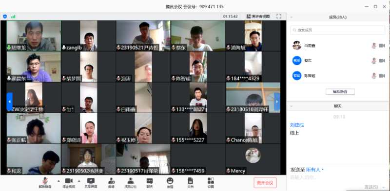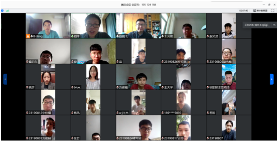 在班会上,2019级的同学们对于线上学习、期末考试及转专业、专业分流等方面提出问题;各班班主任、班导师针对员工们提出的问题进行详细解答:关于期末考试,将采用线上考试或开学返校考试,若线上考试,则个人题目随机,且选项顺序随机。转专业工作则在全体师生返校后,公司教务处统一安排转专业考试,面试。在双学位学习报名方面,班主任、班导师建议学有余力的同学根据内容和兴趣进行申报学习。针对未来的老员工活规划,各班班主任、班导师分别从大创训练和出国交流等方面提出合理化建议。最后,各班班主任、班导师强调,如今疫情虽然转好,但我们仍不能掉以轻心,做好个人防护工作。同时,希望同学们在家中合理利用时间来充实自我。