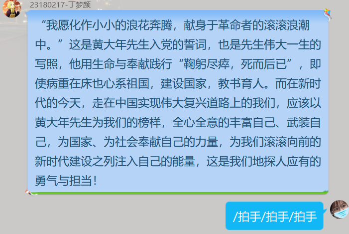 本次活动面向全体团支部,为达到预期效果,活动前期我们对各班团支书进行了简单的培训,各团支部围绕主题开展不同形式的线上活动。通过对抗疫一线工作者们的先进事迹的学习,增强了大家的责任心、使命感。每当看到最美逆行者们忙碌的背影,不禁让我们想起黄大年老师“青春无悔,中年无怨,到老无憾”的寄语,一段关于黄老师先进事迹的视频又勾起了大家的感触。“只要祖国需要,我必全力以赴”,这是黄大年老师人生的写照,更是一名共产党员的初心所在。视频观看结束后,同学们积极发言,“黄大年精神一直是鼓舞着我前行的灯塔,在大学期间特别是疫情期间给予我拼搏奋斗的精神力量”,刘冉明同学这样说。
