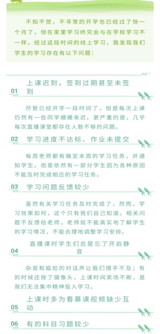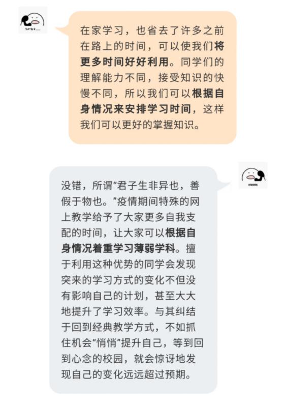"使命":通过网络学习是一种新兴的学习形式,虽然这次是因为疫情原因展开的学习,但是我们也为之后的学习形式进行了探索,积累了丰富的经验,也是为未来的课程改革发展提供了一些力所能及的贡献。