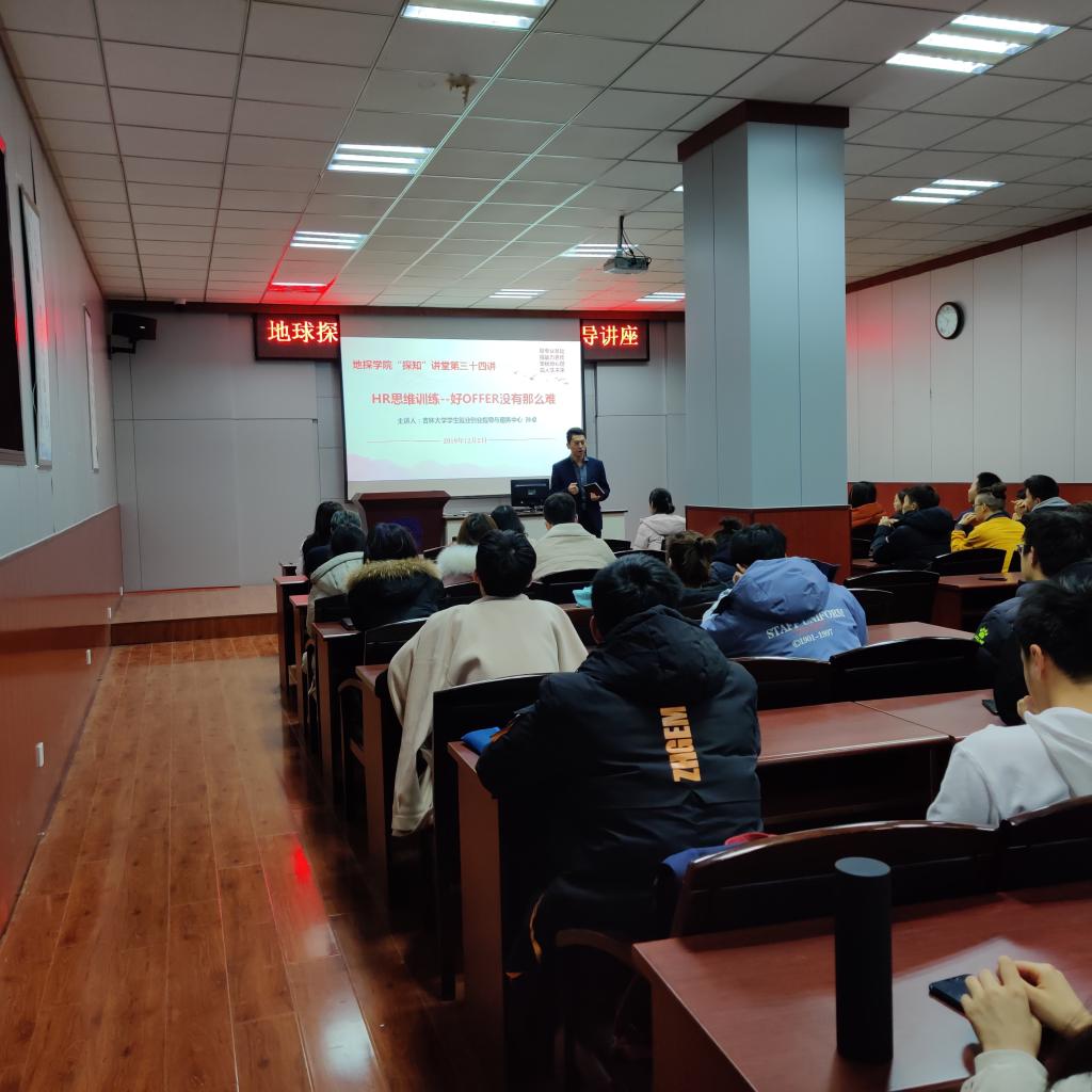 2019年12月2日,永利yl23411在地质宫449举办了2019年度“探知讲堂”第三十四讲——HR思维训练--好OFFER没有那么难。本讲邀请到永利yl23411员工就业创业指导与服务中心孙卓老师担任主讲,由2018级辅导员樊轩铄老师主持。