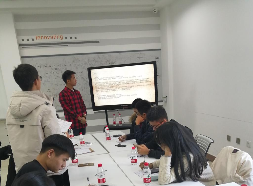 本次活动由团委副秘书长葛霄主持,共12名同学参与其中,就 《礼记·大学》中提到的修身齐家治国平天下的儒家传统思想,及共产党宣言中公平道德,集体认同的马克思现代主义哲学观点进行了学习交流。参与活动的同学们的思想得到了进一步的升华,更加明确了当代青年应先以修身为己任,而后治国平天下的崇高道德理想。学习过后,便是本次活动最令人期待的现场讨论答辩环节,十二位同学现场进行了40分钟的激烈的无领导小组讨论,同学们各抒己见,思辨探索,临场就给出的题目唇枪舌剑,你来我往。最后,由一位代表进行了时长5分钟的总结陈词,就给出的两个问题给出了大家共同得出的解决方案,为讨论环节提供了一份完美的答卷。活动结束后,秘书处将为所有参与同学颁发奖品,为三位投票出的无领导小组讨论环节发言优胜同学颁发奖状。