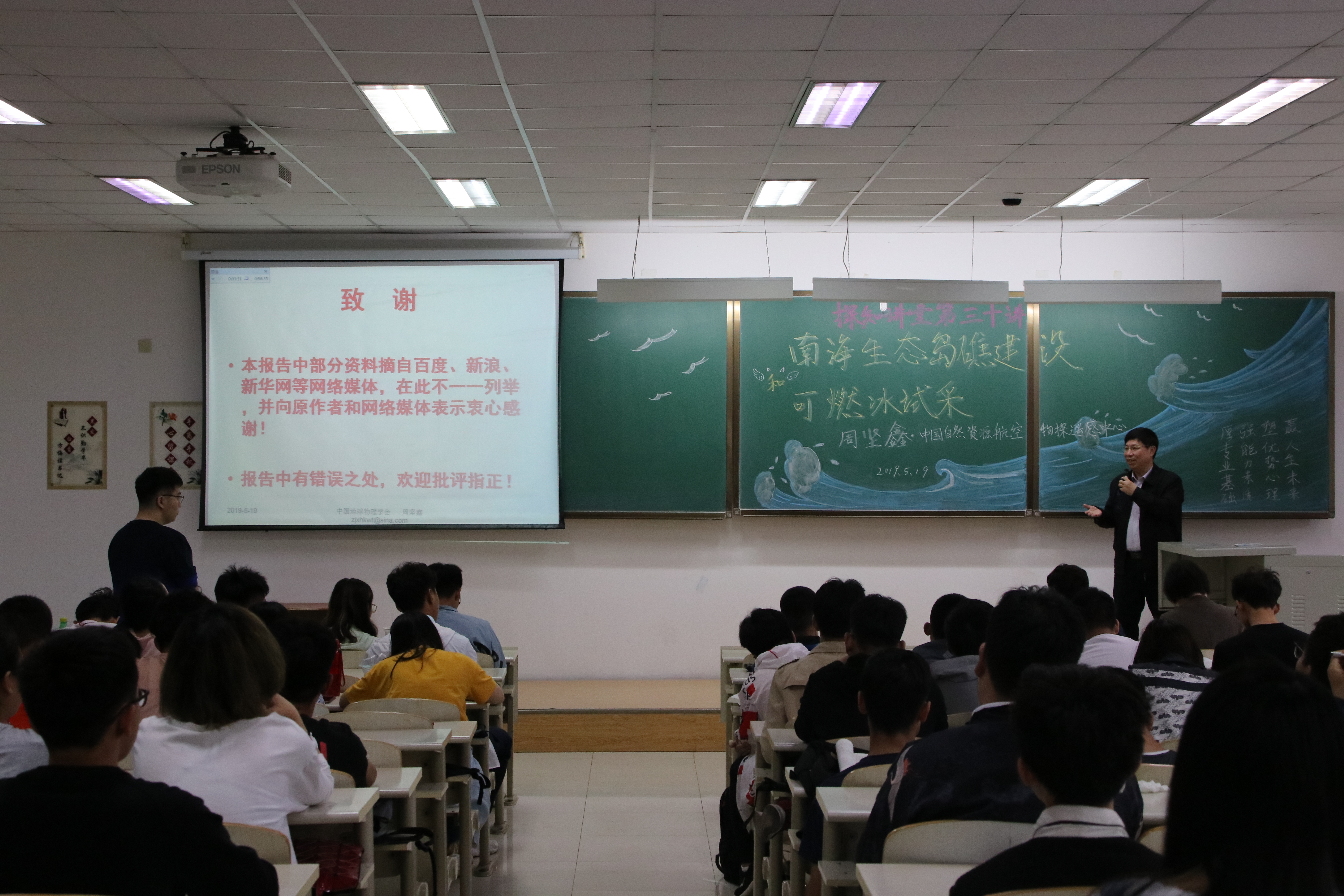为加强地探学子对专业知识技能的掌握,培养员工探索求知的精神。永利yl23411“探知”讲堂第三十讲于2019年5月19日上午9点在李四光206教室开展。本次讲座邀请到了自然资源部航空物探遥感中心副总工程师周坚鑫老师为公司师生作题为“南海生态岛礁建设与可燃冰试开采”的专题讲座。周坚鑫老师长期从事海洋和航空地球物理学方面的工作,是中国地质调查局“杰出地质人才”、863计划重大项目课题负责人,并获得过“全国科普工作先进工作者”的荣誉称号。公司党委书记高淑贞老师,党委副书记宋宏宇老师,团委书记司镇通老师,2018级全体员工以及地学部其他感兴趣的同学参加了本次讲座。