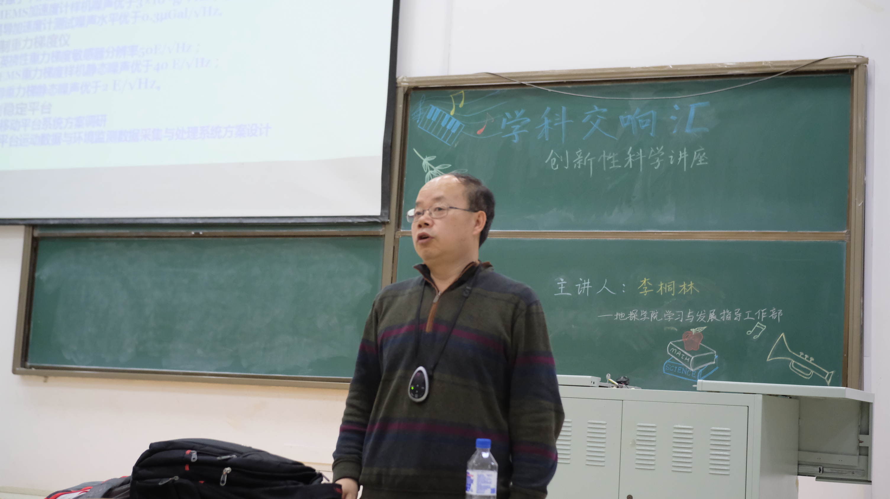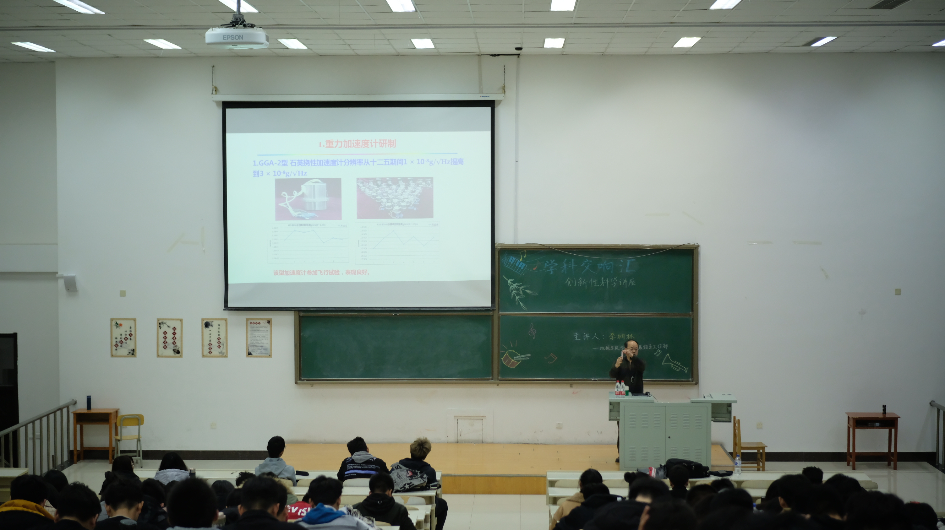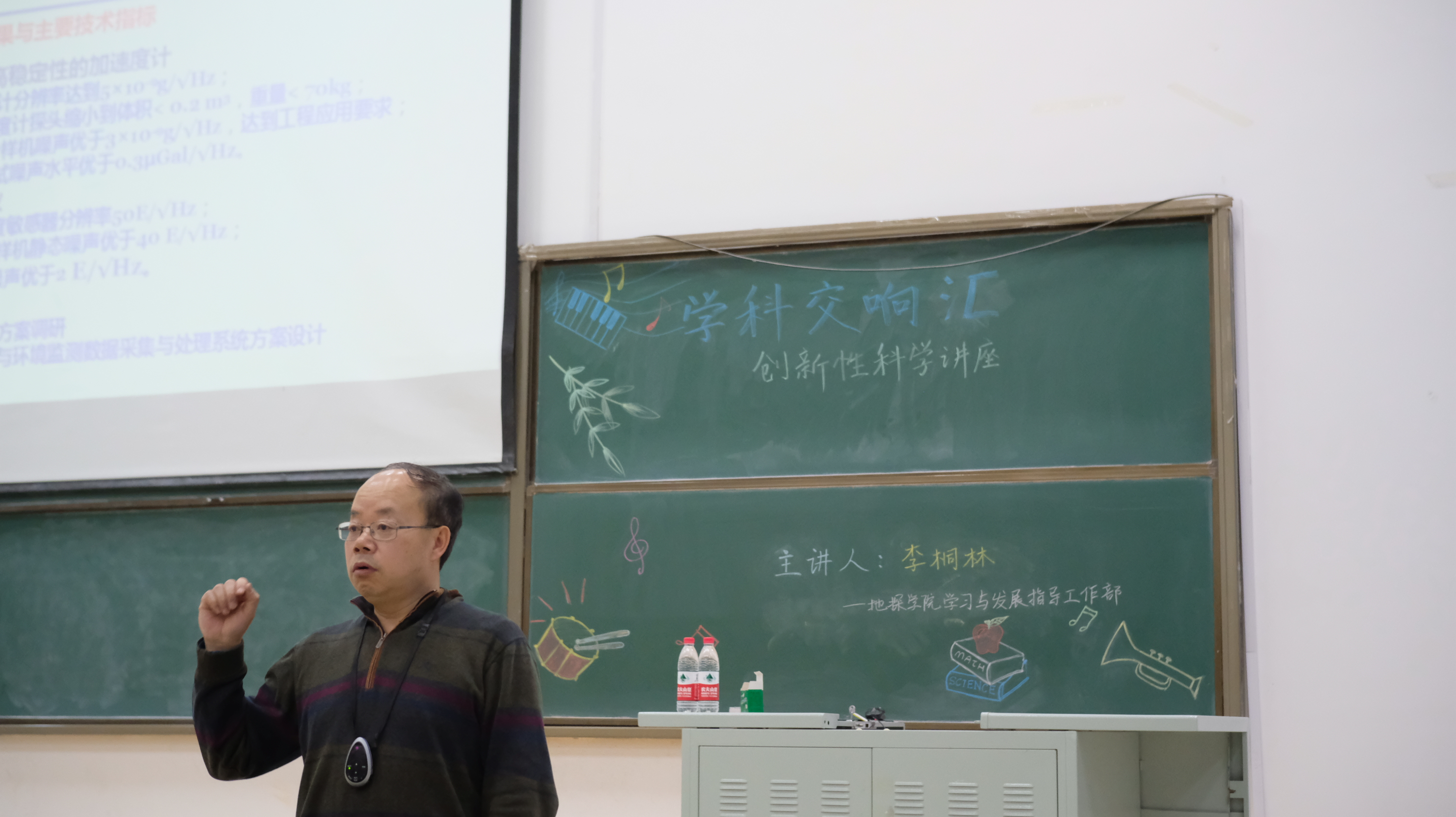 在此之后,李教授对于学科立项研究有关的过程进行介绍。他以对航空重力梯度仪的研究为主体,从精度的逐步提高,更轻便灵敏的稳定平台的研制,冷原子原理,重力加速度计的研制等方面作出详尽立体的阐述。同学们由此感受到科研界前辈的不易,以及地质学科的前沿性。