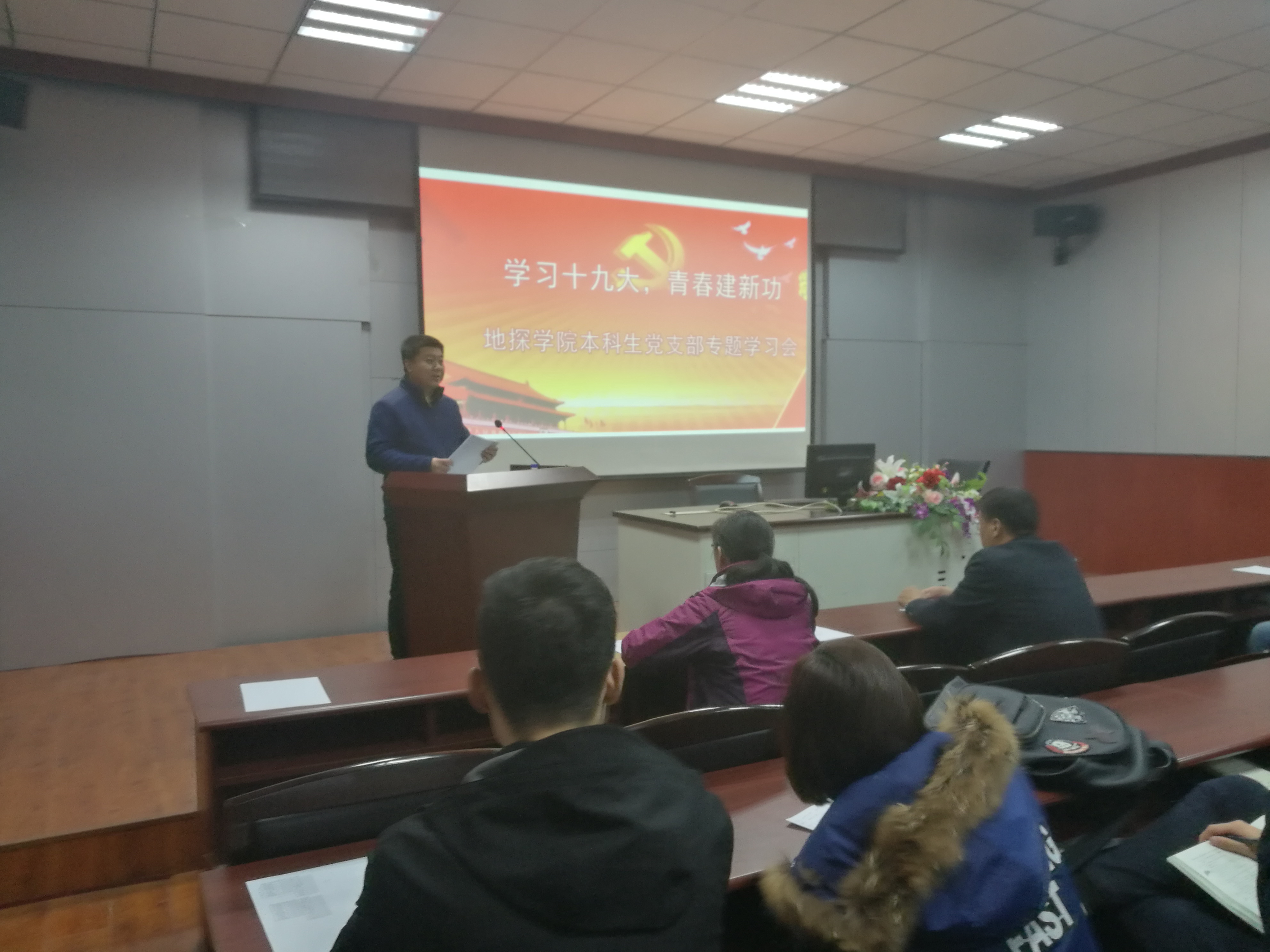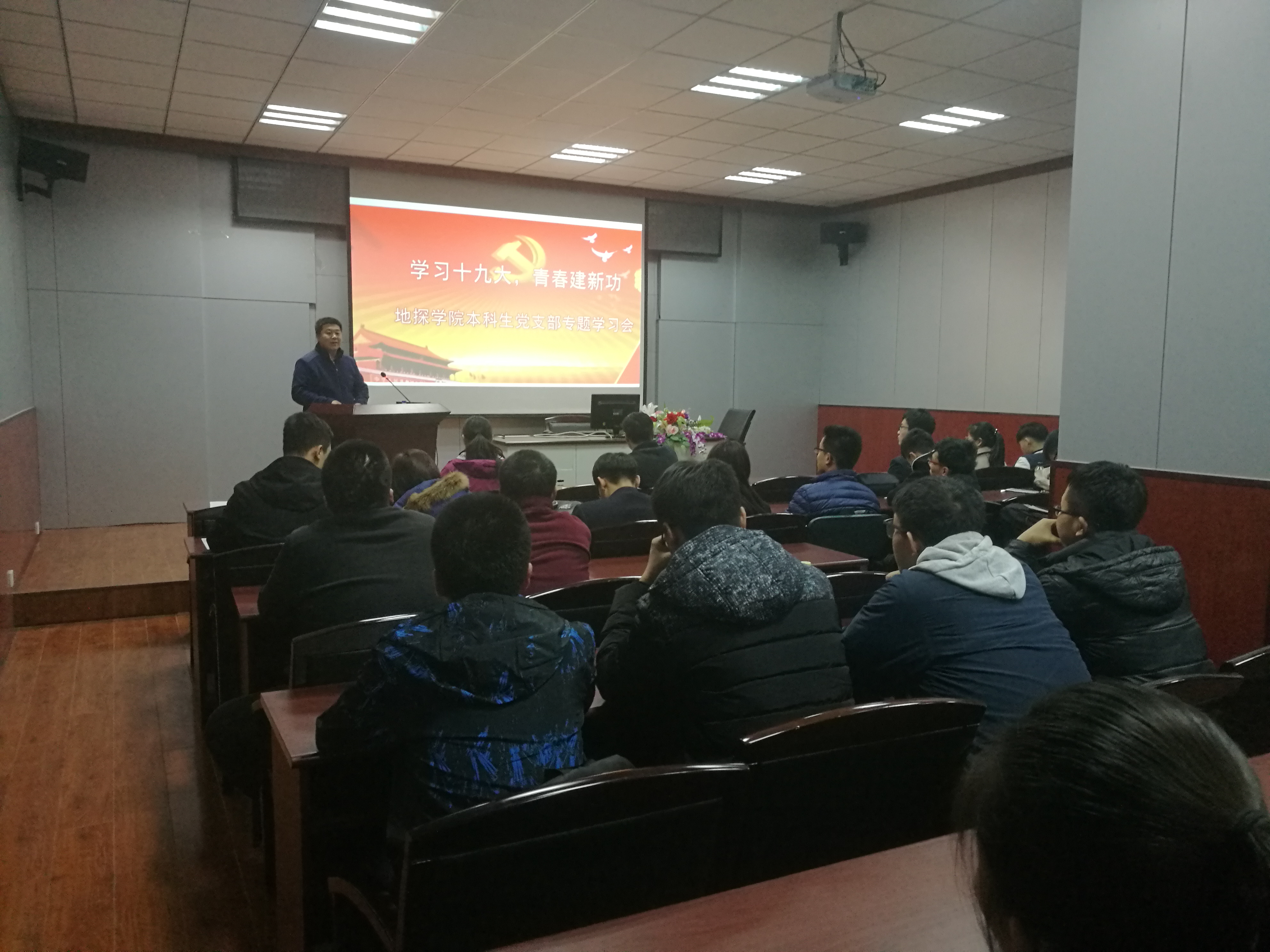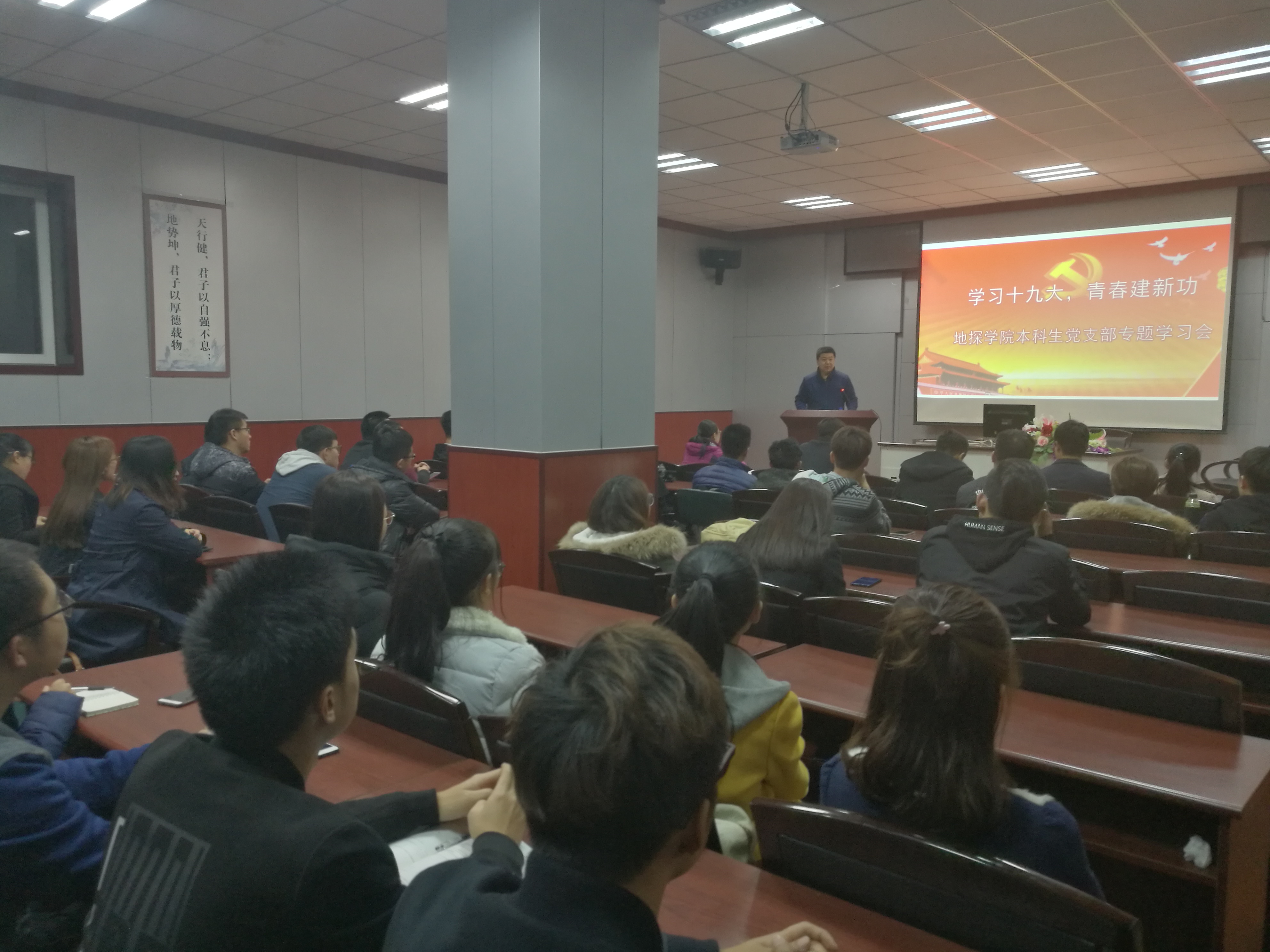 2017年10月24日晚6点,永利yl23411本科生党支部在地质宫449报告厅开展了“学习十九大,青春建新功”专题学习会,公司党委副书记宋宏宇,学办主任于学武,辅导员金璐,司镇通以及全体本科生党员参加了本次学习。
