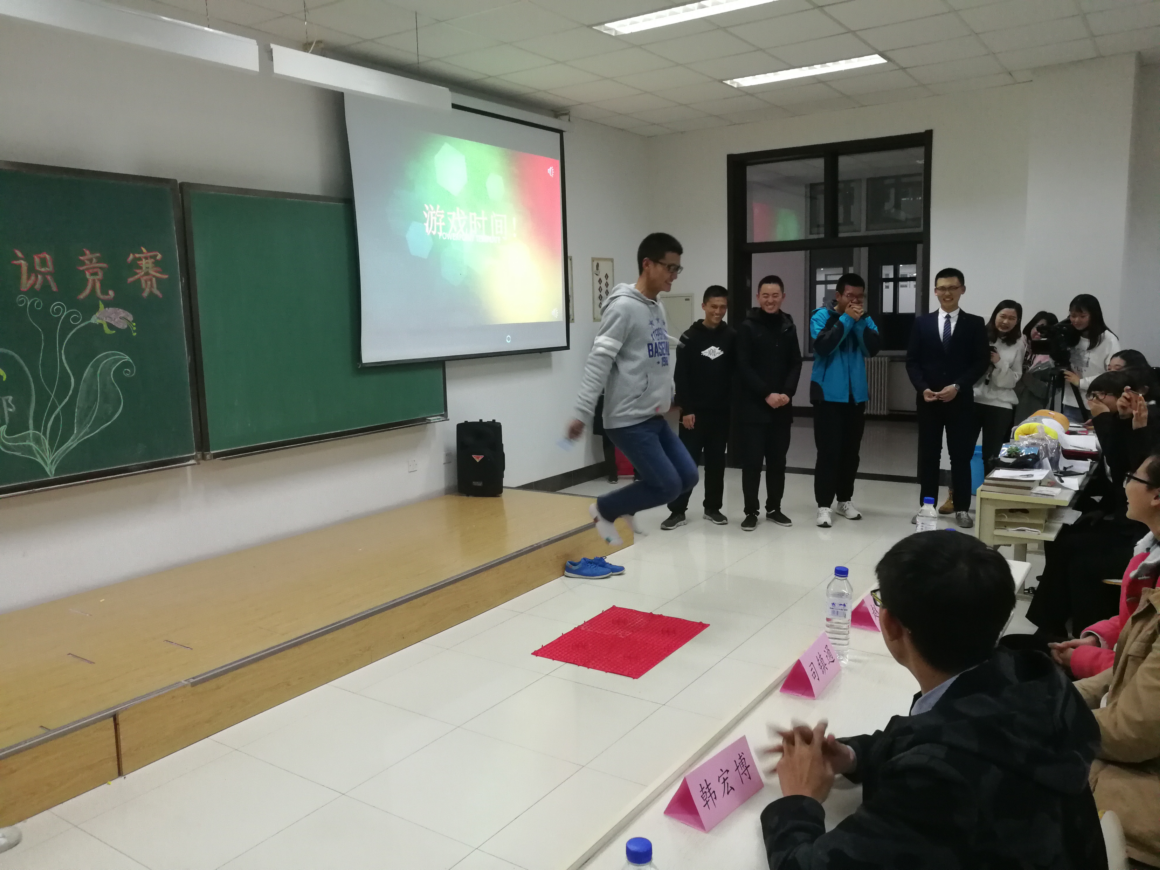 第二项“金字塔得分题”登场,该题考验的是组员之间的斟酌策略,团队合作,以及道具卡的使用,其中九班代表队艺高人胆大,出色的答题引起同学们一阵阵的呐喊欢呼;在“黄金一百秒”环节中,组员们反应敏捷,不假思索。在一阵头脑风暴之后,决出胜出者:三,七,九班。然后进行本场活动的第二个游戏环节:向左看,向右看,队员时不时的错误动作引得老师和同学们捧腹大笑,场面热火朝天。