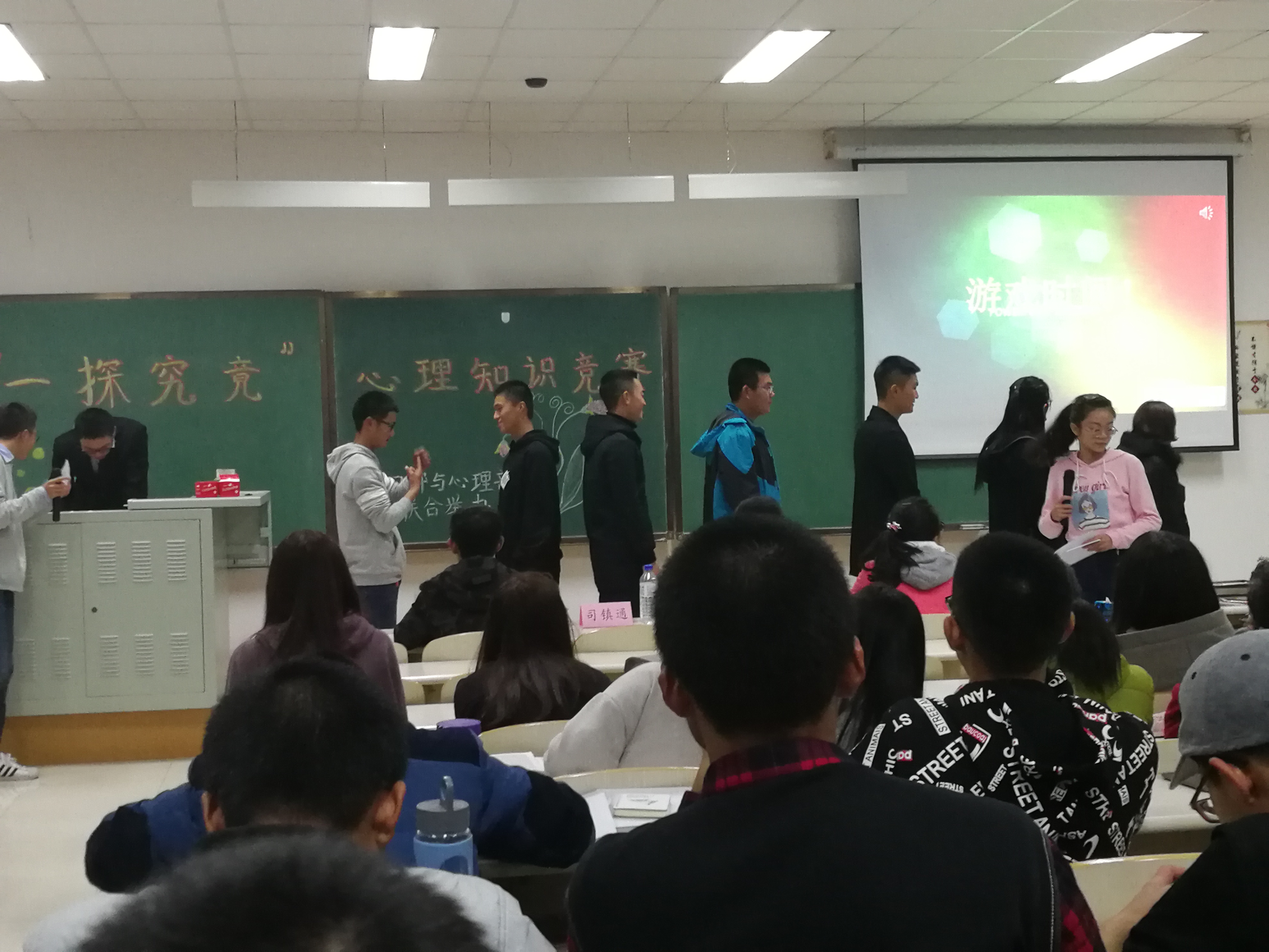 下午六点半,心理知识竞赛正式开始,首先进行第一个环节第一项:“八道轮回测试题”,各班代表队才华横溢,胸有成竹,应对如流。在经历一番的测试之后,其中一、三、五、七、九班以全部答对的惊人成绩晋级。接下来是同学们的游戏时间,第一个游戏是猜词游戏,同学们积极踊跃,依次进行了“一针见血”,“指鹿为马”的词语考验,伴随着欢声笑语,第一个环节愉快结束。