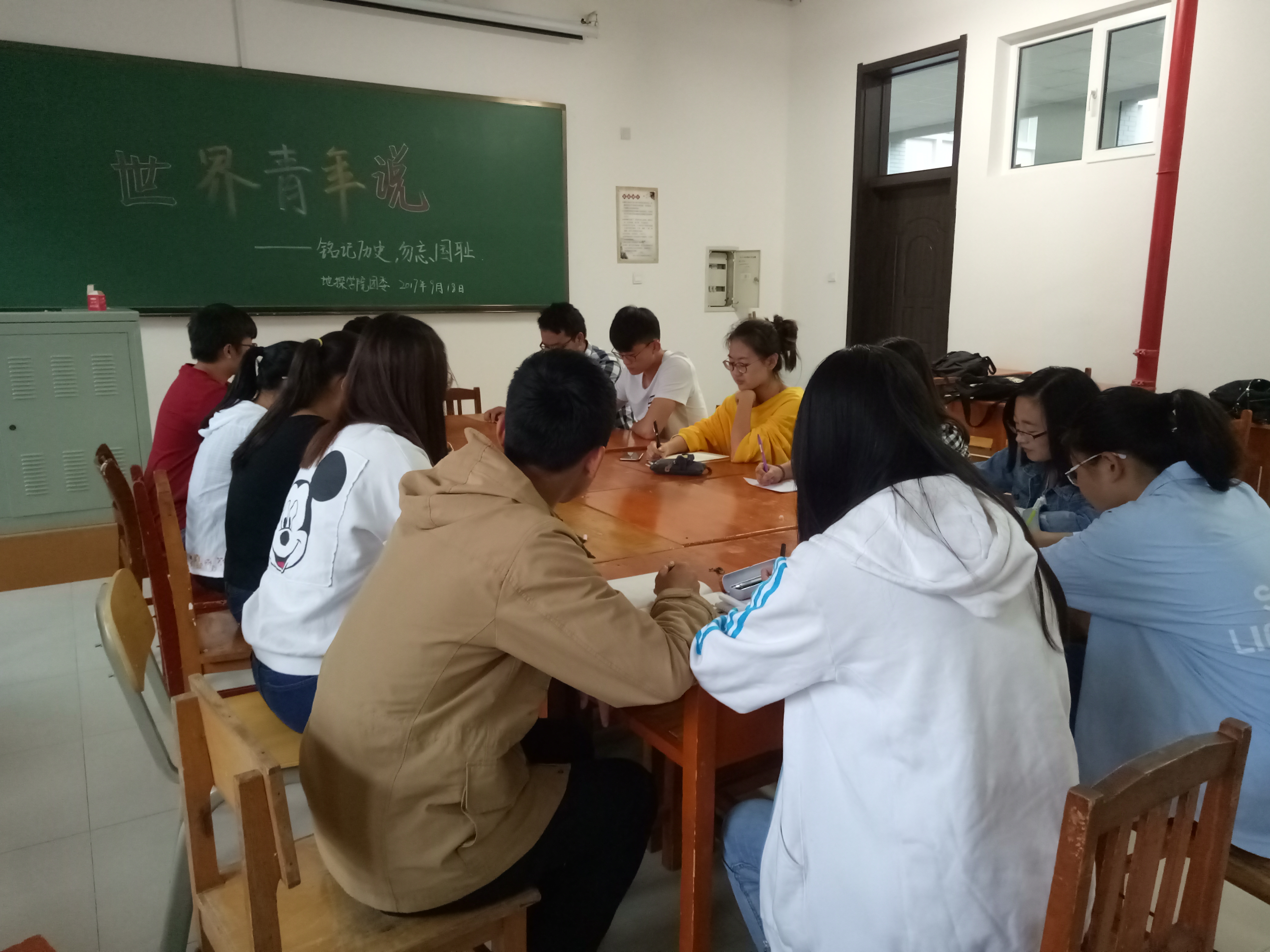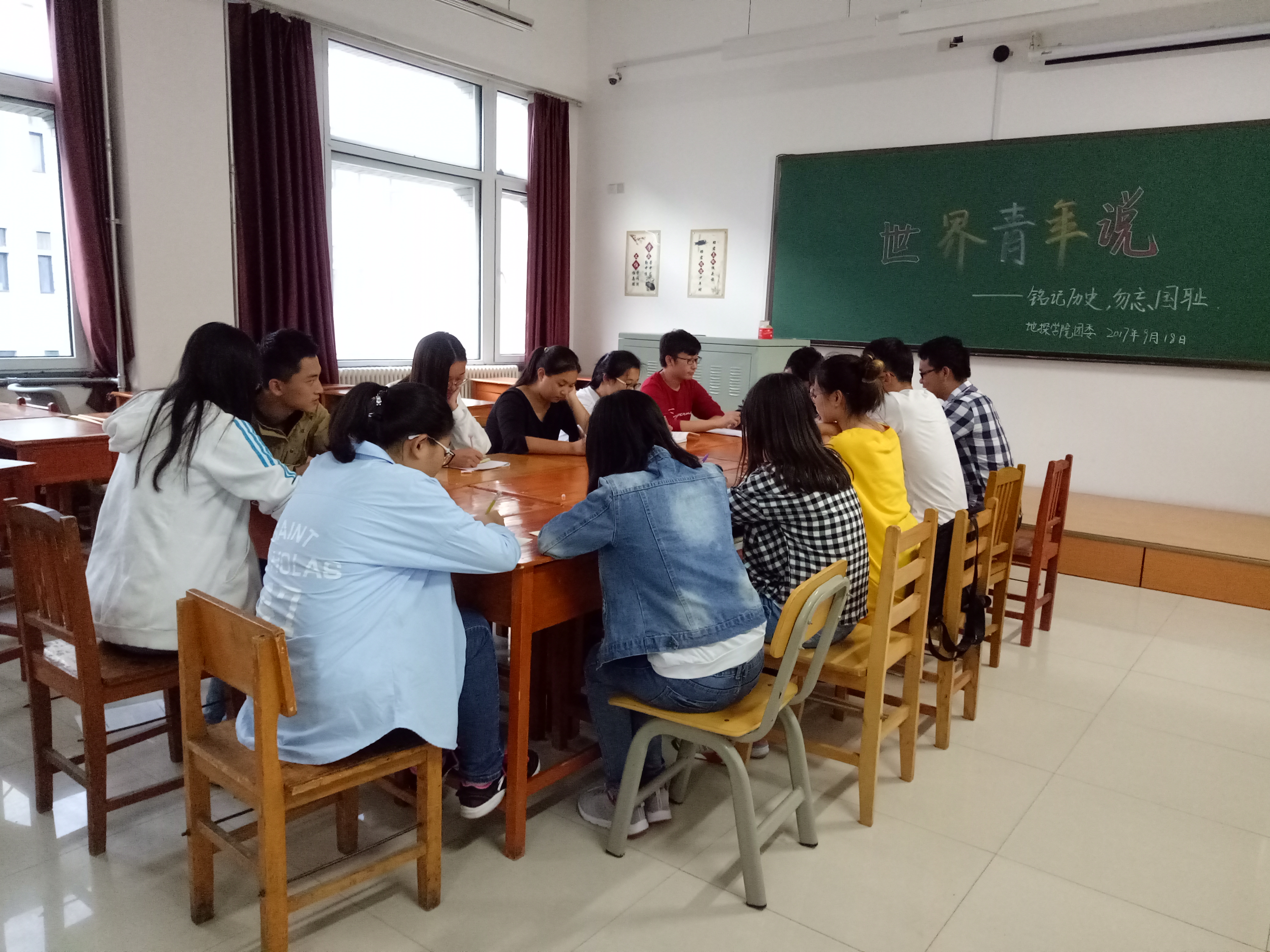 2017年9月18日中午12时30分,由永利yl23411团委组织部、社工部、秘书处组织的世界青年说之纪念“九·一八”活动在李四光楼108室开展,本次活动由永利yl23411团委常务副书记张泊滔主持。