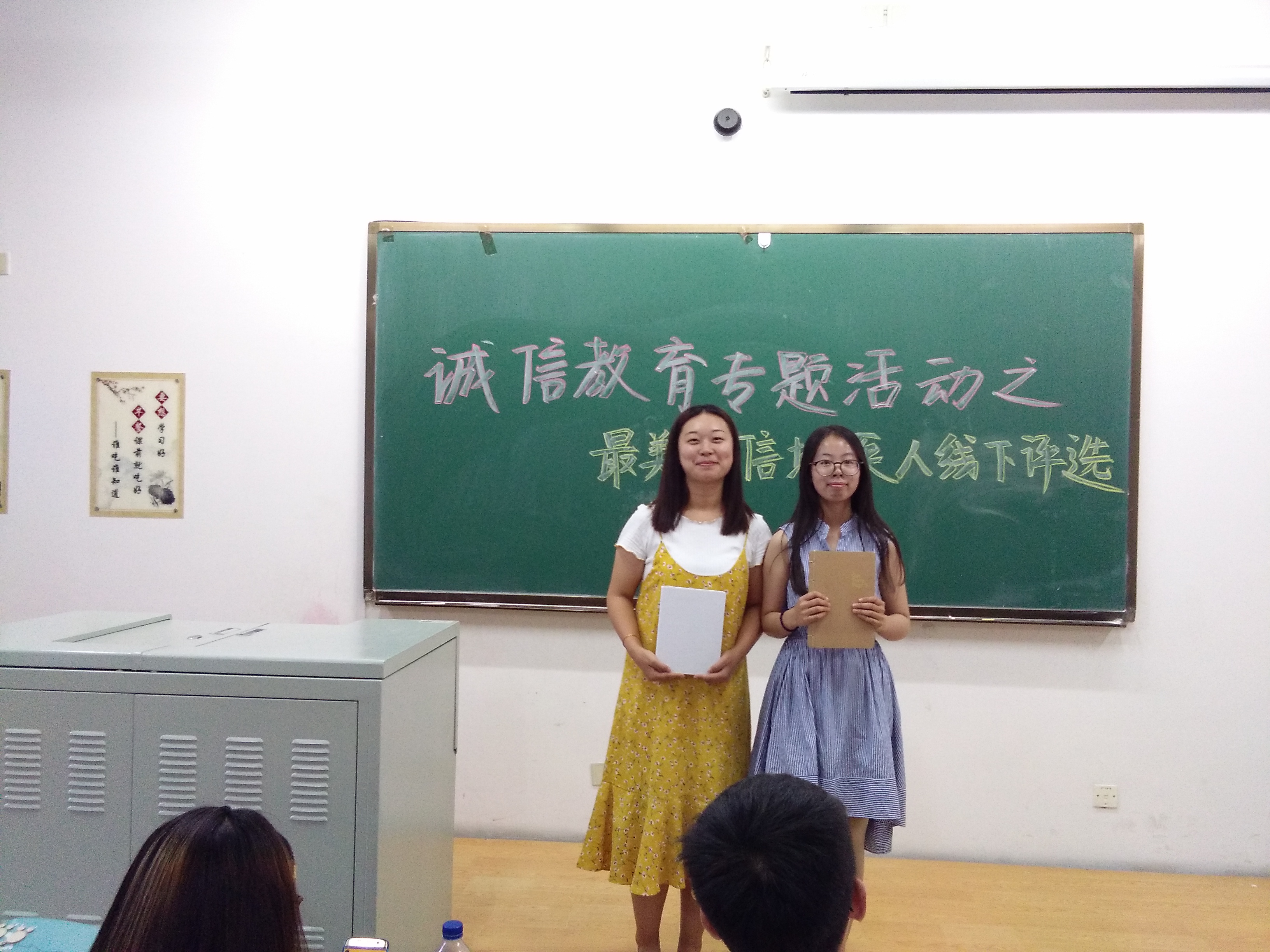 活动开始,主持人介绍了诚信教育的重要性以及作为老员工履行诚信意识、共创诚信校园和诚信社会的光荣使命,并介绍了最美诚信地探人的候选人。接着由各位候选人进行自我介绍以及他们在日常学习生活中的诚信行为。然后由在场员工代表进行无记名投票,并现场查票。评选出2016级员工王奕和王佳鑫为最美诚信地探人。最后由团委常务副书记张泊滔为她们颁发奖品并合影留念。