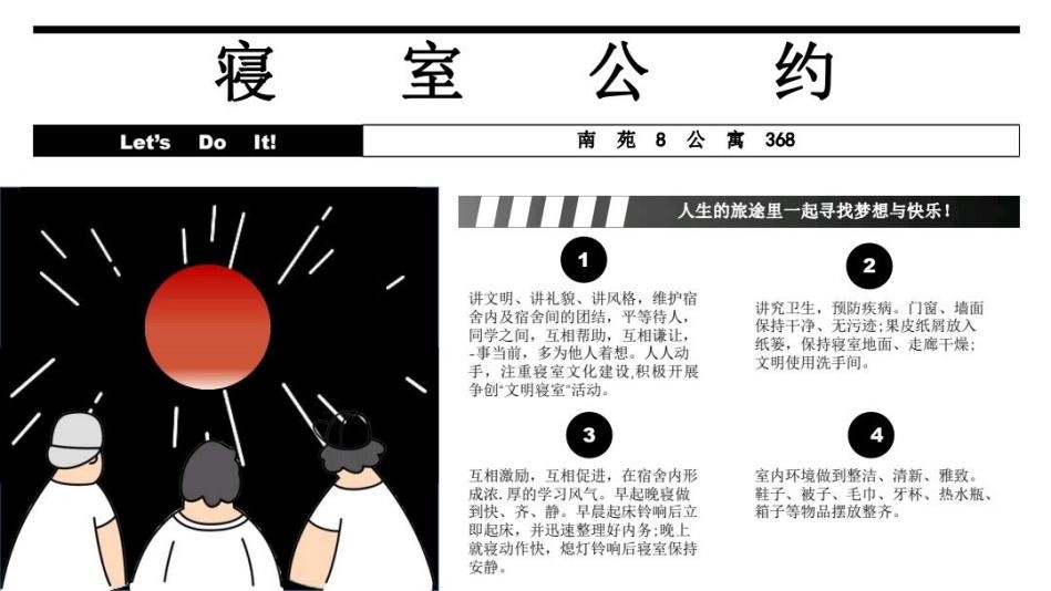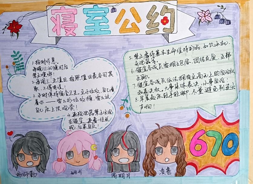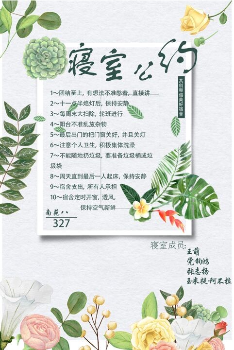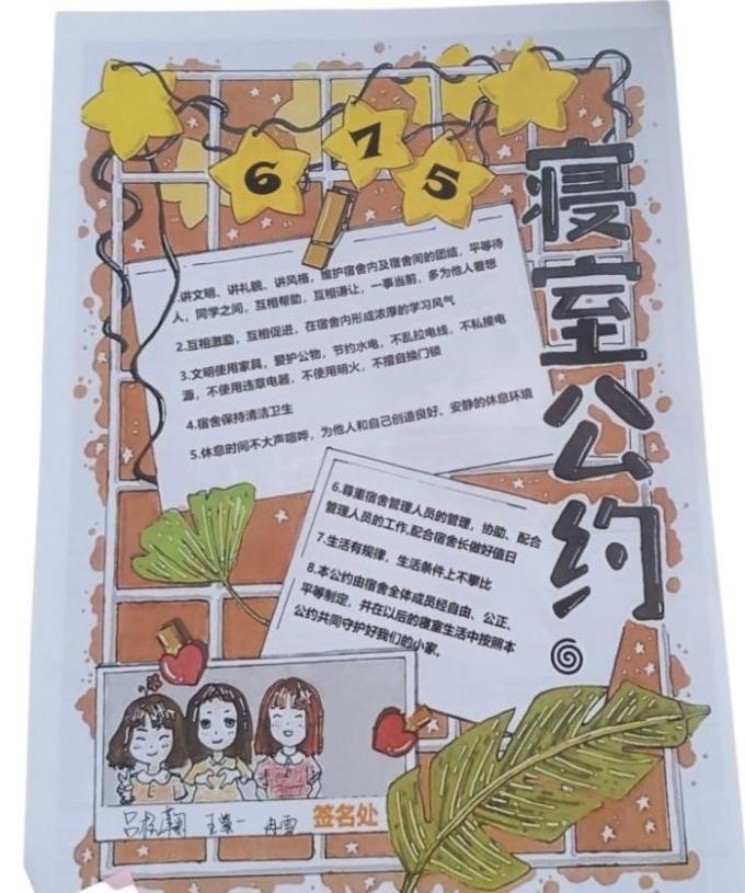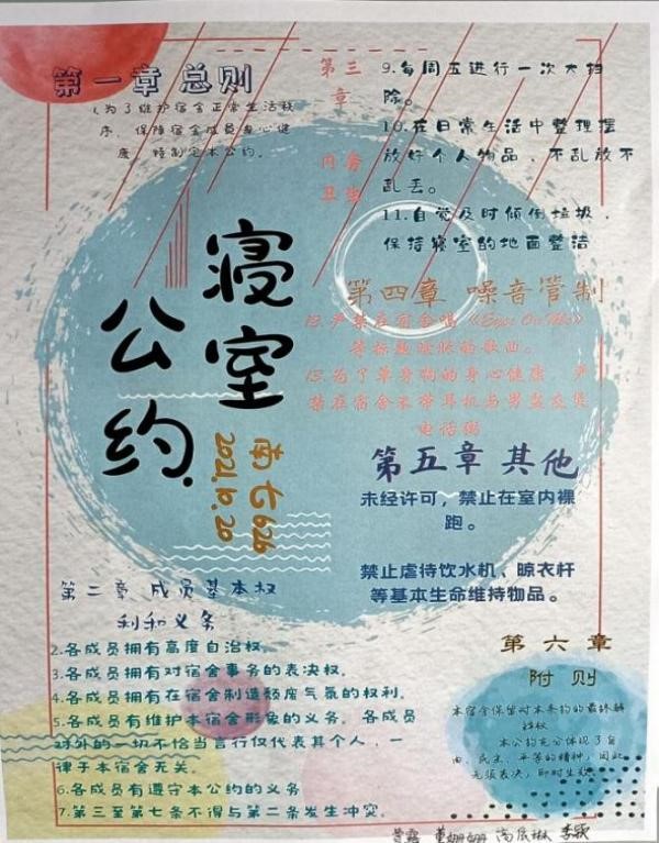 此次活动的目的是为促进寝室和谐,减少寝室之间的小摩擦。通过交流协商,将作息时间、轮流值日、寝室安全等方面列入公约之中。活动一发布,同学们便积极参与,各位制作人发挥了自己的想象天赋,在与室友们的沟通交流中完成了寝室公约的制作。尽管时间紧张,但同学们在最后还是成功交上了他们设计独特,风格各异的寝室公约,充分将和谐、友爱又有秩序的寝室氛围体现出来。