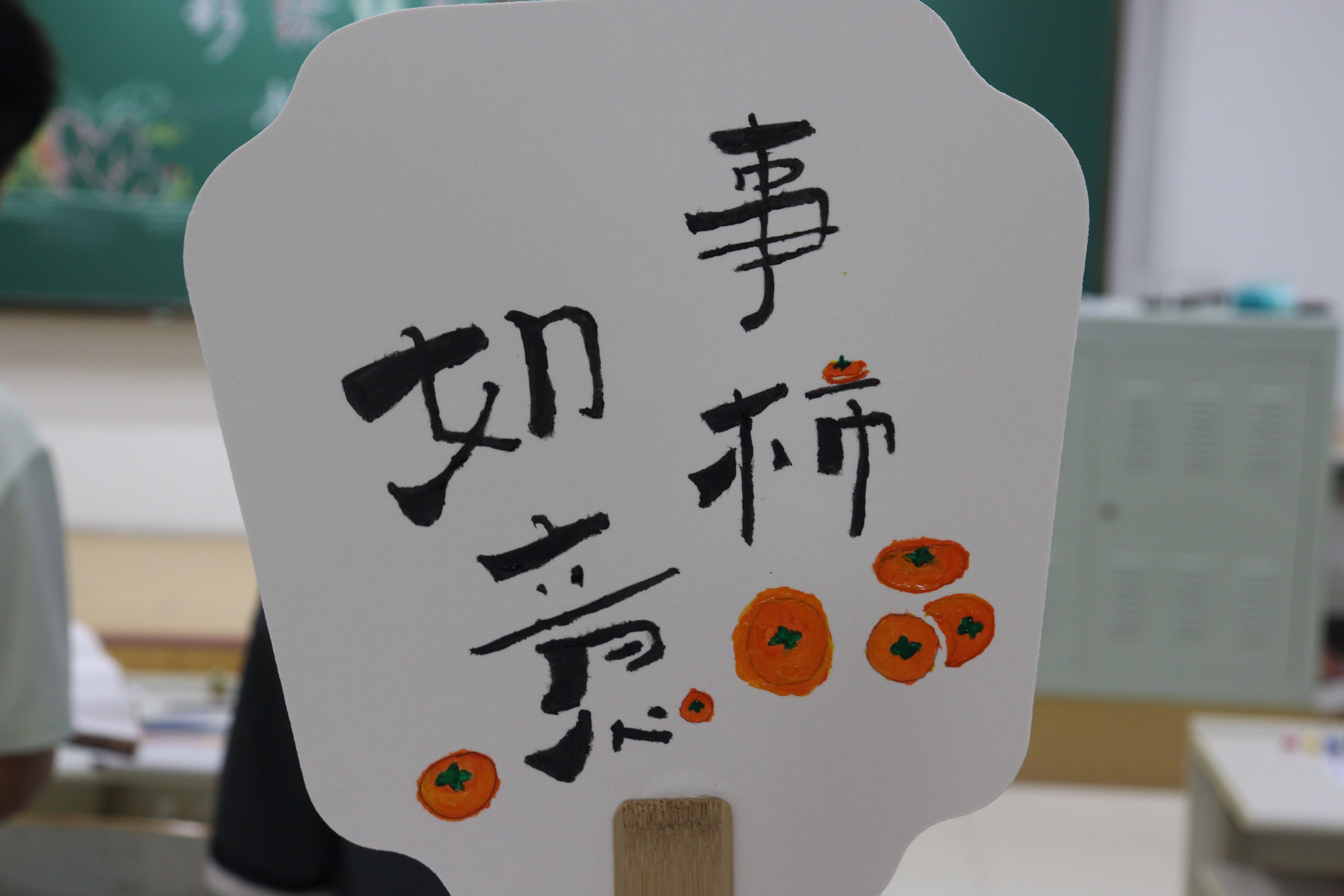 晚16:35,工作人员和志愿者开始准备绘画所需的扇子和材料,布置活动的场地。17:30,同学们到达现场,有序地领取彩笔和扇子,在工作人员的指引下开始绘画。本次活动准备了折扇、圆扇、花瓶形扇、椭圆形扇等多种扇面,有绘画基础的志愿者设计扇面图案,并现场教授绘画技巧。