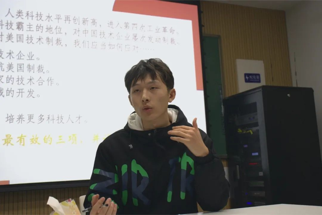 本次活动以无领导小组讨论的形式开展,参与同学共分为两组,同学们以“在当今世界,我们应如何应对美国技术制裁”这一话题展开讨论。同学们置身于世界发展之中,立足于国家决策之中,以此感悟“世界格局,风云变幻”的波澜壮阔。