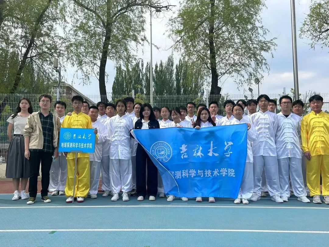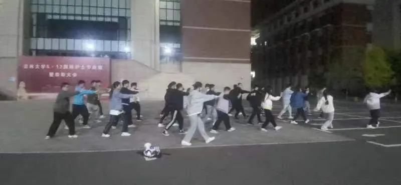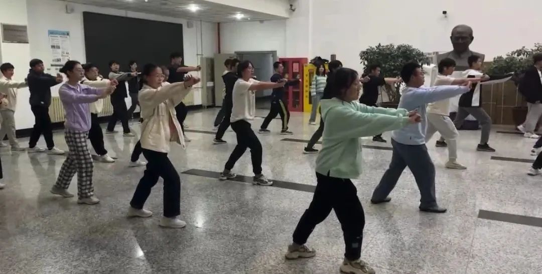 八极拳方阵和太极拳方阵分别位于李四光实验楼大厅及三阶篮球场附近。在领队的带领下,同学们从刚开始的不熟悉不协调逐渐开始得心应手。古文里有说:“知止而后能定,定而后能静,静而后能安,安而后能虑,虑而后能得。”同学们认真做好每一个动作,不辞辛劳,将身心安住当下,全神贯注,努力做到动作整齐划一。八极拳方阵的同学展现出八极拳的刚猛爆裂,气势磅礴。太极拳的同学们也将太极拳的刚柔并济,连绵不断展现的淋漓尽致。