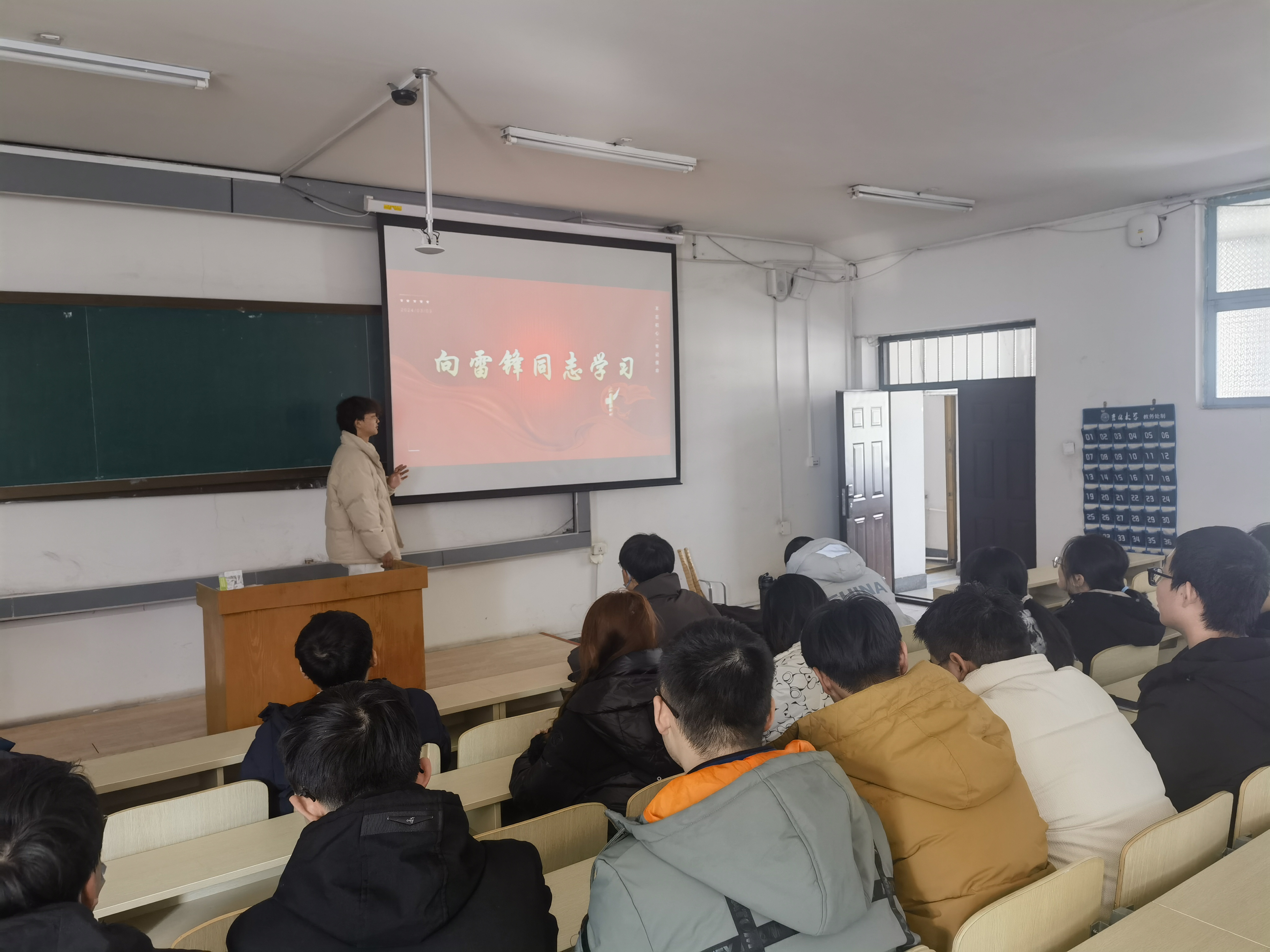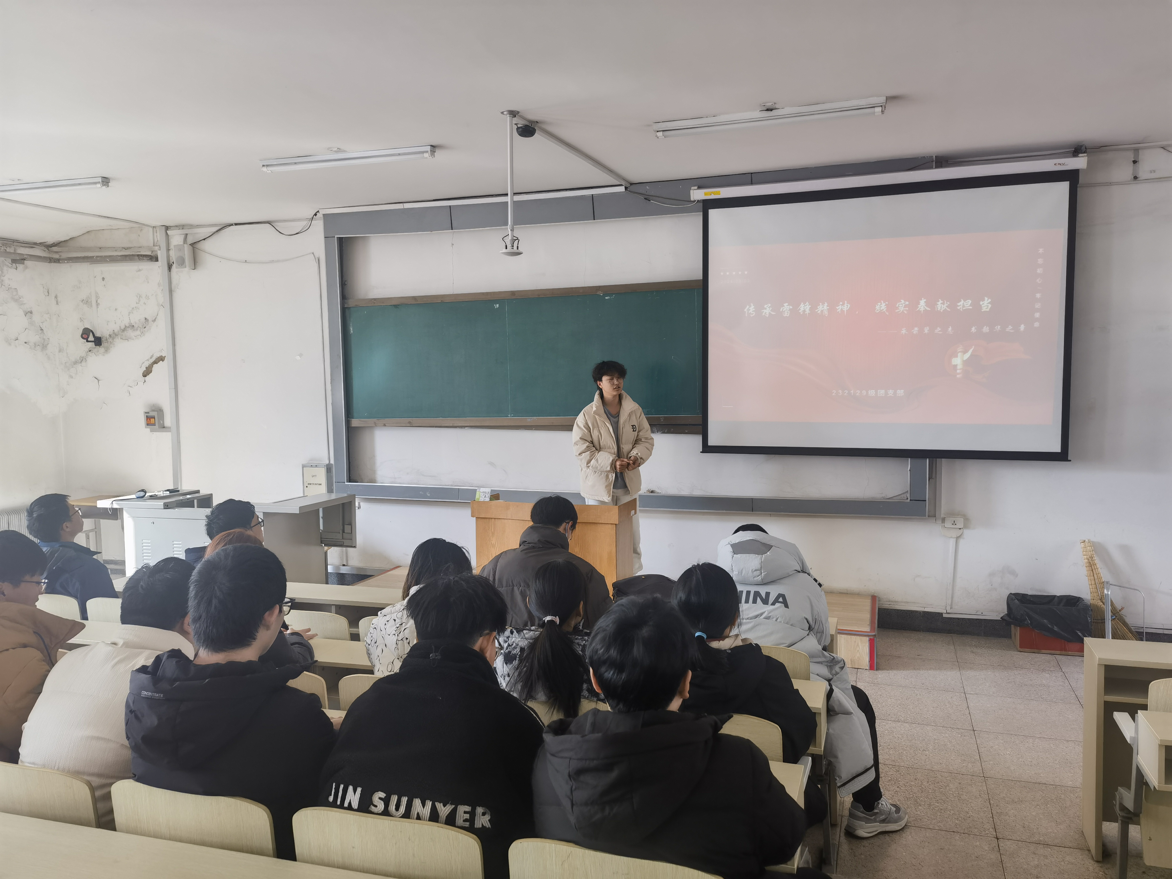 团支书贺永强讲道,雷锋精神就是热爱党、热爱国家、热爱社会主义的崇高理想和坚定信念;服务人民、助人为乐的奉献精神;干一行爱一行、专一行精一行的敬业精神;锐意进取、自强不息的创新精神;艰苦奋斗、勤俭节约的创业精神。雷锋精神体现着新中国成立后昂扬向上的时代风貌和精神状态,彰显着中国共产党人的初心使命,是弘扬伟大建党精神的生动写照,已经融入中华民族的精神血脉,成为人们所敬仰和追求的精神文化。雷锋精神是对雷锋事迹所蕴涵的崇高品质的凝练升华,内涵丰富、意蕴深刻。在市场经济快速发展、物质生活日益丰富的今天,雷锋精神永远不会过时,因为它与中华民族的传统美德和伟大的民族精神联系在一起。学习雷锋精神向上、向善的精神内涵,对于同学们刻苦钻研、坚定信念、担当责任有着巨大的感召。