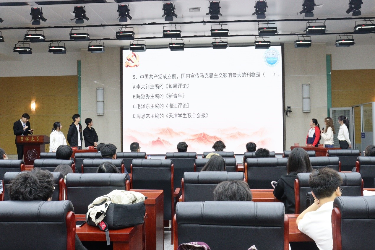 党团知识竞赛决赛在慷慨激昂的《中国共产主义青年团团歌》中拉开序幕。本次决赛共设有“一站到底”“争分夺秒”“党史微讲堂”三个环节。
