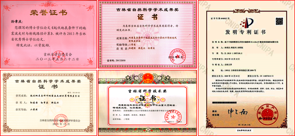 [1] 专利名称:基于不规则模型孔径的共偏移距Kirchhoff叠前深度偏移成像方法;发明人:孙章庆、韩复兴、刘明忱;专利号:ZL 2019 1 0957100.6;专利申请日期:2010年10月10日;授权公告日:2020年10月23日.(已授权)