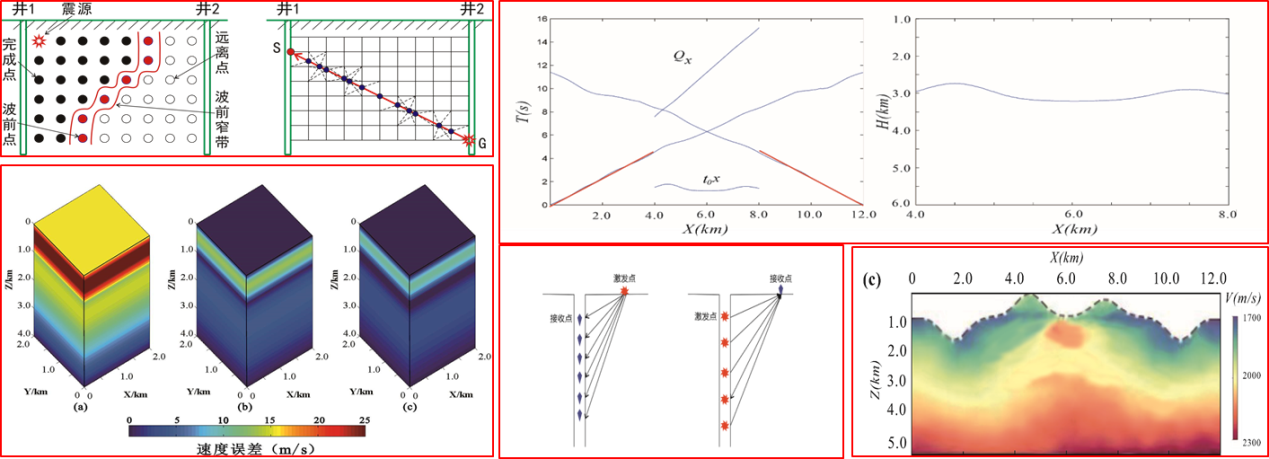 目前在本研究方向上,核心关注近地表速度建模问题,形成了包括井间层析、近地表多信息约束下的初至成像和复杂海洋水体速度精细建模的近地表速度建模方法。核心包括:基于精细网格射线追踪的井间层析(图3-左上),小折射、微测井、近地表调查等约束下的近地表初至层析(图3-右)和基于海底反射走时反演的高精度水体速度建模(图3-左下)等。上述这些速度建模方法,以国家重点研发计划为依托,在我国南海复杂区海水速度精细建模方面发挥了重要作用。