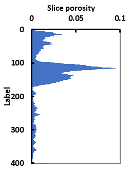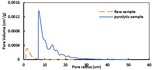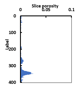 从未热解岩样中钻取2mm的柱样进行分辨率为2μm的CT扫描,将扫描切面叠加在一起,构成如图1(a)所示的数字岩心,图中深色表示低密度,浅色表示高密度,蓝色表示孔隙空间。从图中可以看到,岩心包括一段颜色较浅的砂质层和两端的深色粘土有机质混合层。对扫描图像进行了阈值分割,得到了岩样的孔隙空间(图1b),同时统计了图像的纵向面孔率(图1c)。对热解后的岩石样品进行分辨率为11.47μm的CT扫描,采取这么大的分辨率进行扫描是因为热解后孔隙空间会增大。图2(a)、2(b)和2(c)分别是热解后岩石的全貌、孔隙空间和纵向面孔率。可以看出热解后岩石孔隙空间增大的很明显。图3是热解前后在纵向上的对比图。图4是为采用最大球法从数字岩心中提取的孔径分布。热解前后的分布峰值分别为1.2 um和8.2 1um。然而,由于CT扫描分辨率的影响,孔隙分布的实际峰值比这些值要小。在原始样品的微米级尺度上也有少量孤立孔隙,热解后发现有大量微米级裂缝发育。