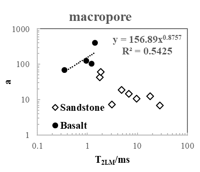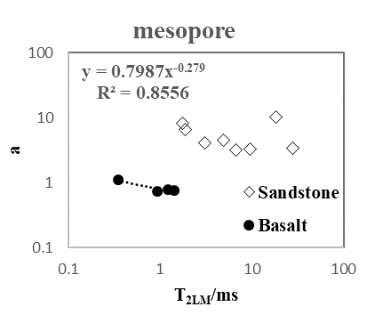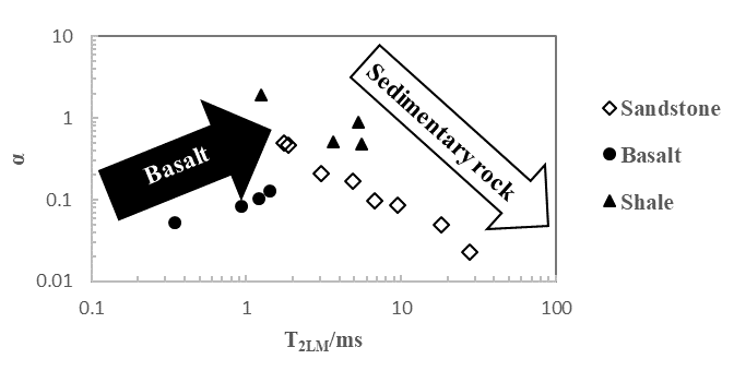 图4.不同孔隙尺寸和岩性下α和T2LM的关系
